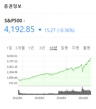 한국의 코스피지수도 최근들어서 어마어마한 상승률을 기록하고 있는 것은 사실이지만, 2020년 코로나 사태 이전에는 거의 9년 이상을 횡보하는 모습을 보였으며 코스피지수는 과거에는 거의 변동폭이 없는 수준이었다. 하지만 미국의 S&P 500 지수를 추종하는 ETF의 경우는 지수를 따라서 우상향하는 모습과거의 데이터로 보여주고 있기 때문에 되도록 S&P 500 지수를 추종하는 상품에 투자하기를 권한다.