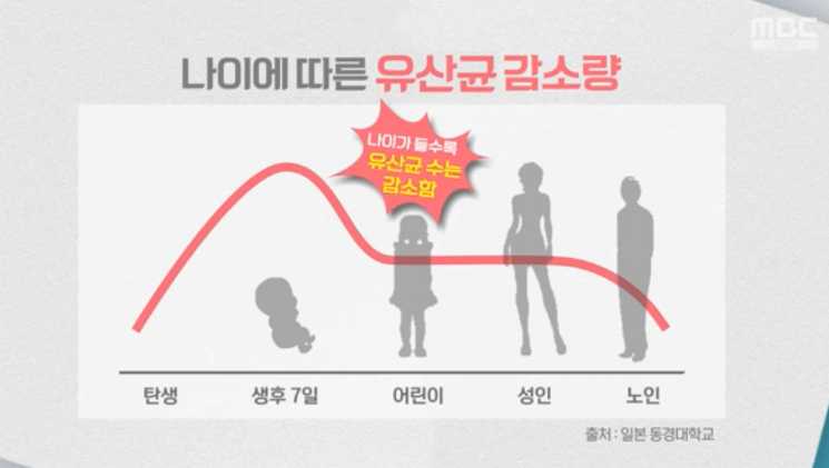 유산균은 말 그대로 산성으로 장내에 젖산을 많이 만들어내서 유해균이 더이상 장 내에서 살 수 없도록 환경을 조성하는 역할을 하는데 안타까운 점은 나이가 들수록 장 내의 유익균 비율이 점점 줄어든다는 것이다.