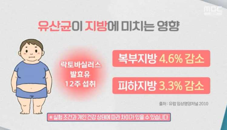 유산균과 지방이 무슨 상관이 있을까 생각하겠지만, 한 연구결과에 따르면 비만인 경향이 있는 성인에게 유산균의 한 종류인 락토바실러스 발효유를 12주간 섭취하게 했더니 초기 수치와 비교해서 복부지방도 약 5% 감소하고 피하지방도 약 3% 이상 감소했다는 결과가 있었다.