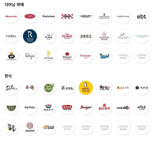 간략하게만 요약해보면, 피자헛, KFC부터 시작해서 쉐라톤호텔인천, 밀레니엄힐튼 서울, 치르치르, 매드포갈릭, 애슐리, BBQ,, VIPS, 페리카나, TGI, 서가앤쿡, 롤링파스타, 반올림피자샵, 라그릴리아, 티바두마리치킨, 도미노피자, 타코벨, 모스버거, 굽네치킨, 본죽, 국수나무, 유가네, 긴자, 니뽕내뽕, 얌샘김밥, 아비꼬, 북촌손만두, 생어거스킨, 천지연 등등 정~~말로 다양한 외식 브랜드들이 머지포인트와 제휴를 맺고 있는 상태다.