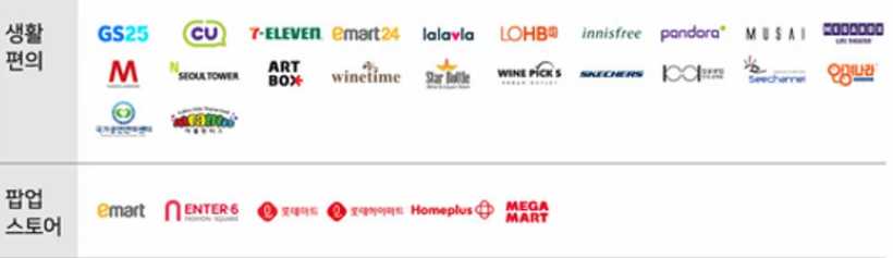 파리바게트, 뚜레쥬르, 파리크라상, 던킨도너츠, 명랑핫도그, 빽다방, 크리스피그림, 엔젤리너스커피, 베스킨라빈스, 카페베네, 설빙, 이디야커피 등등 다양한 사용처를 확인할 수 있다.