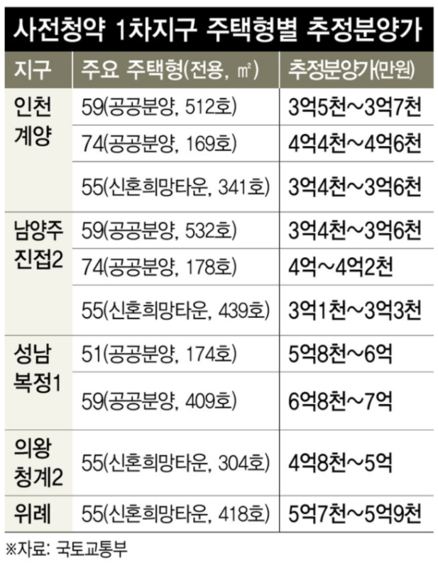 최종적으로 본 청약에서 3기 신도시의 사전청약 분양가가 확정될 예정이지만, 아마 저기 있는 예상 분양가보다 저렴할리는 만무해보인다.