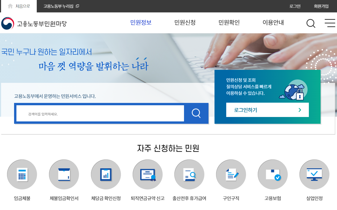 고용노동부 사이트에 접속한 후에, 로그인을 해야 한다.