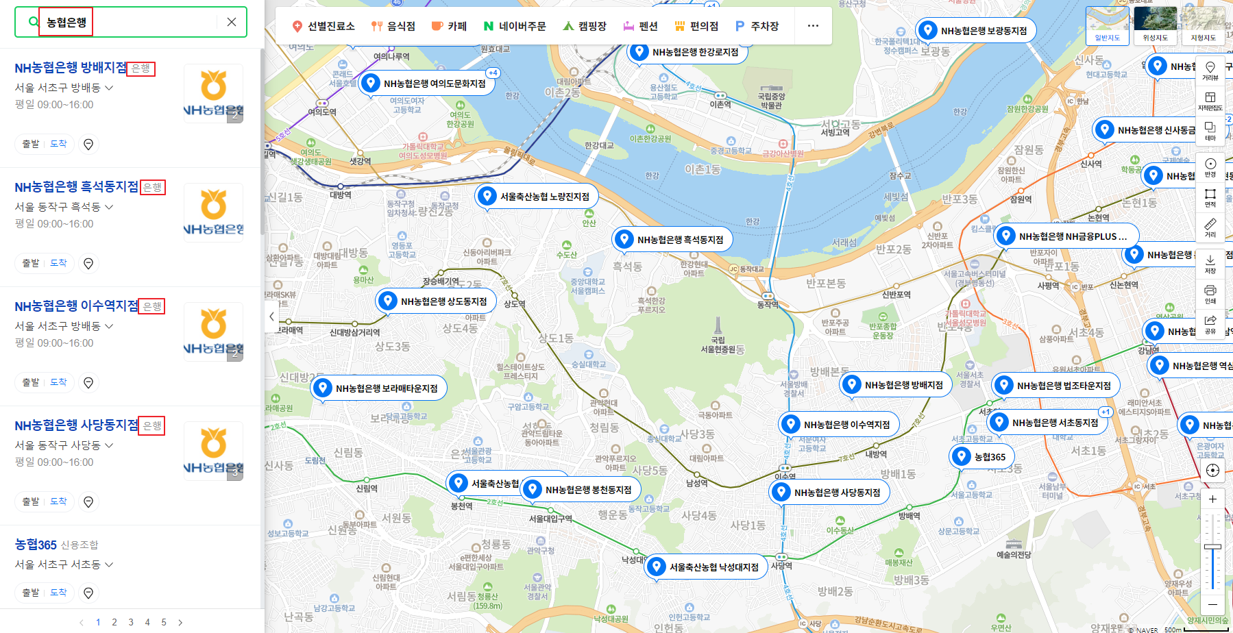 검색하고자 하는 지역을 지도에서 찾은 후에 검색창에 '농협은행'이라고 치면 농협중앙회, 즉 은행이라고 부를 수 있는 농협중앙회만 지도에 표기가 된다.