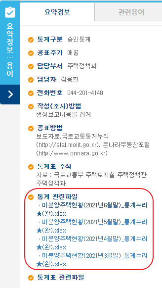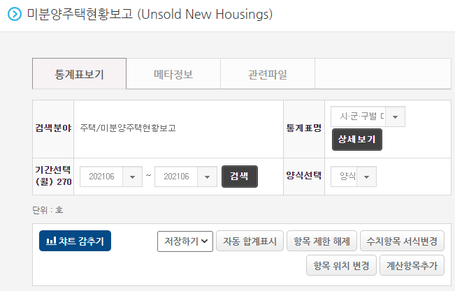 또한 화면의 우측에 보면 아래와 같은 사진이 보일텐데 아래의 사진에서처럼 통계 관련 파일에 들어가면 지역별로 전국 미분양 아파트에 대한 통계를 보면서 수요를 예측할 수 있다.