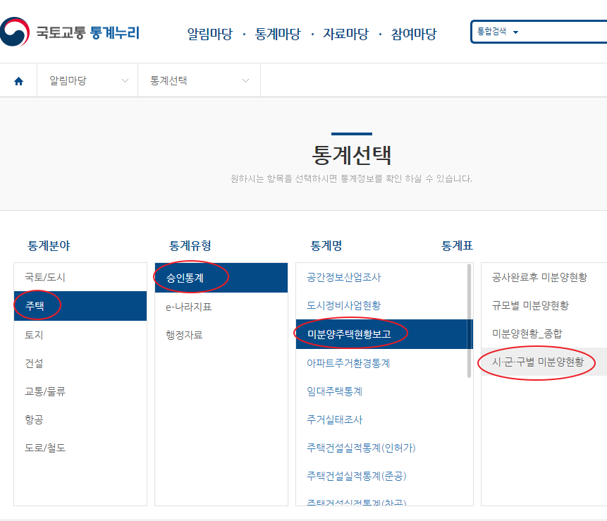 그 뒤에 위의 사진처럼 주택 - 승인통계 - 미분양주택현황보고 - 시/군/구별 미분양 현황 순서대로 클릭해서 들어간다.