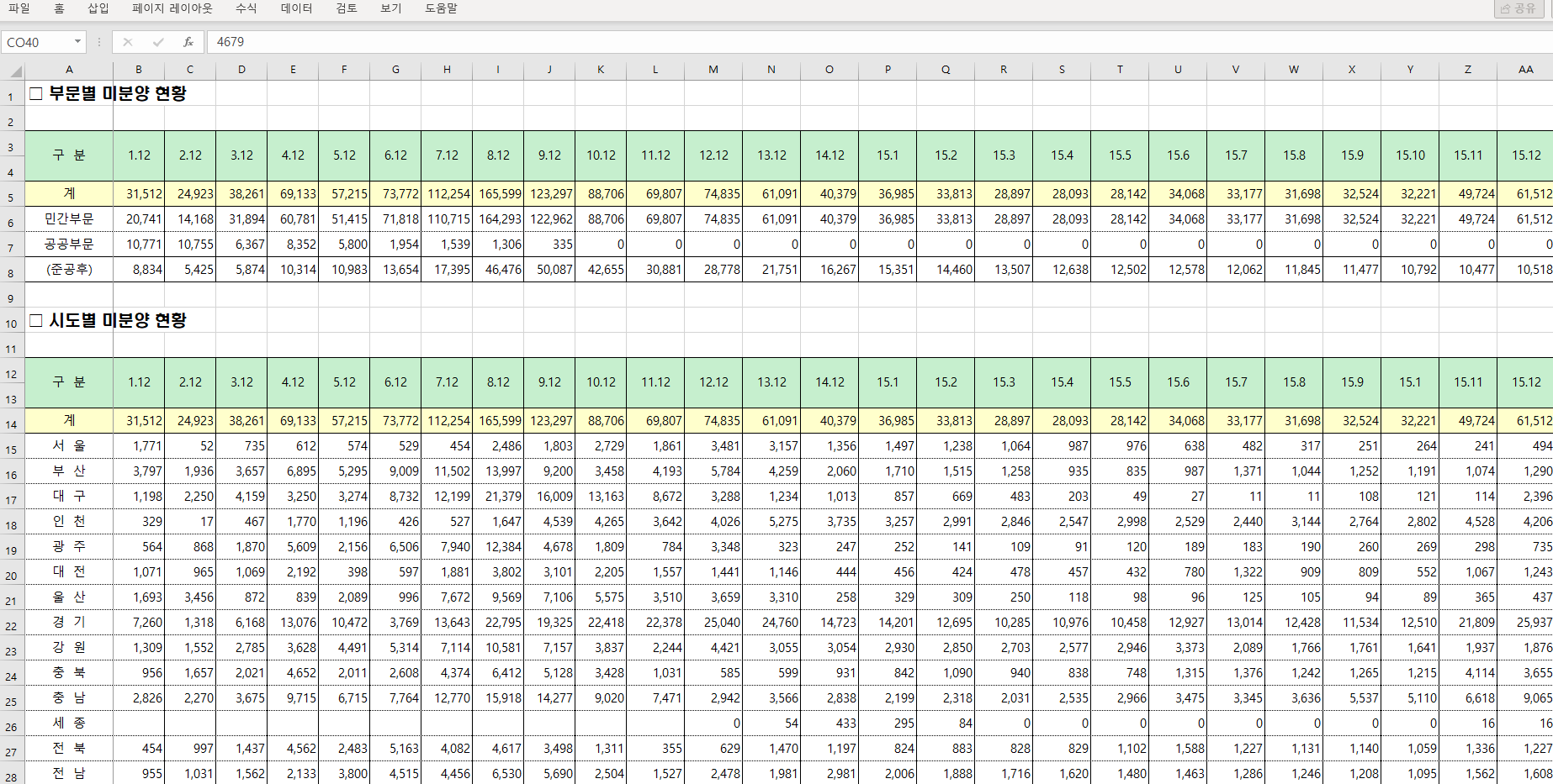 위 사진에 있는 엑셀파일을 다운받은 후에 실행하면 우측에 보이는 미분양 관련 엑셀파일이 열리고, 정확한 수치로 한눈에 전국의 미분양 현황을 파악하는 것이 가능하기 때문에 좋은 자료로 사용될 것으로 예측된다.