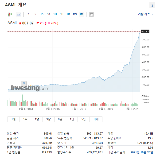ASML은 반도체 업제에서 독점적인 지위를 가지고 있기 때문에 지속적으로 성장가능성이 있고, 제조업 분야에서는 나오기 힘든 영업 이익률을 보유한 기업이다.
