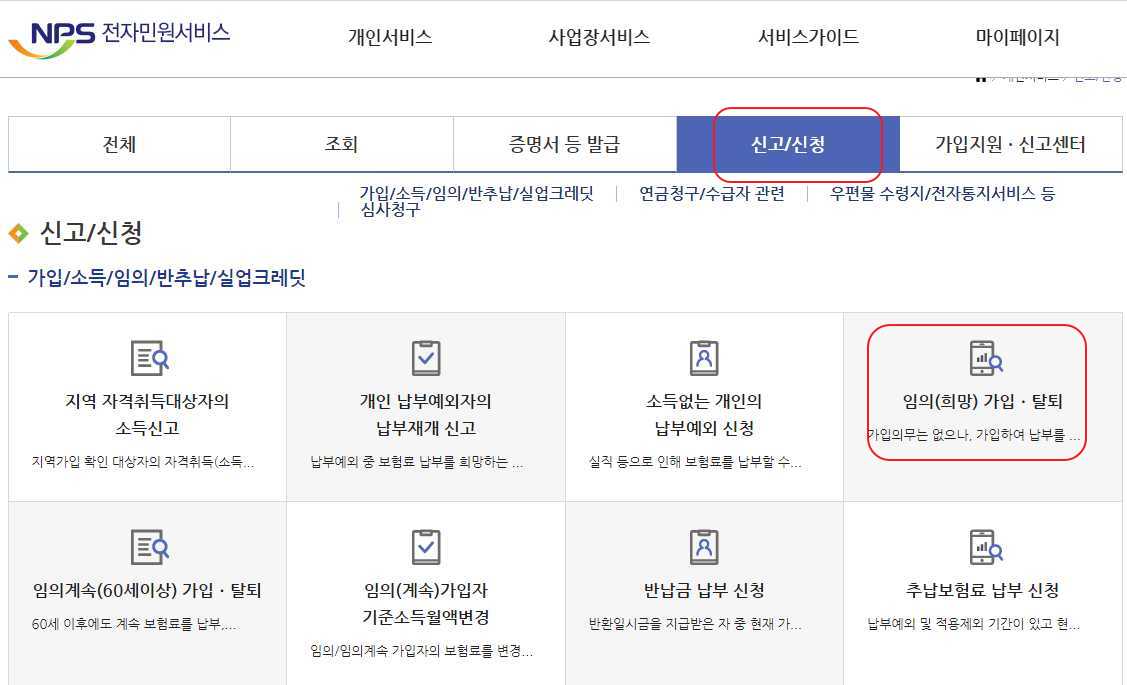 로그인을 하면 아래의 사진과 같은 화면이 나오게 될 것이다. 아래의 사진에서 <신고/신청>란에 들어가면 <임의(희망)가입/탈퇴> 라는 메뉴가 보일 것이다.