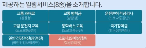 구삐는 총 8종의 알림서비스를 지원한다. 교통과태료부터 범칙금, 운전면허 적성검사, 고령운전자 교육, 통학버스 교육, 국가장학금, 건강검진 정보를 알려준다. 게다가 최근에 가장 핫한 키워드라고 할 수 있는 코로나 예방접종 일정과 장소 등의 정보를 받을 수 있으니 알림서비스를 하면 무조건 이득일 것으로 생각된다.