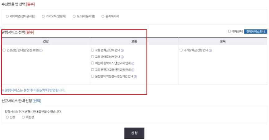 아무튼, 알림서비스 선택에서 내가 받고 싶은 안내를 모두 고른 후 신청을 하면 간단하게 모든 신청이 끝난다.