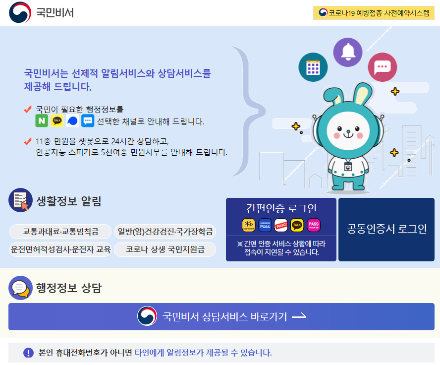 위의 사진처럼 국민비서 구삐 사이트에 접속한 이후에는 국민비서 서비스를 신청하려면 간편인증을 하거나 공동인증서로 로그인을 해주어야 한다.