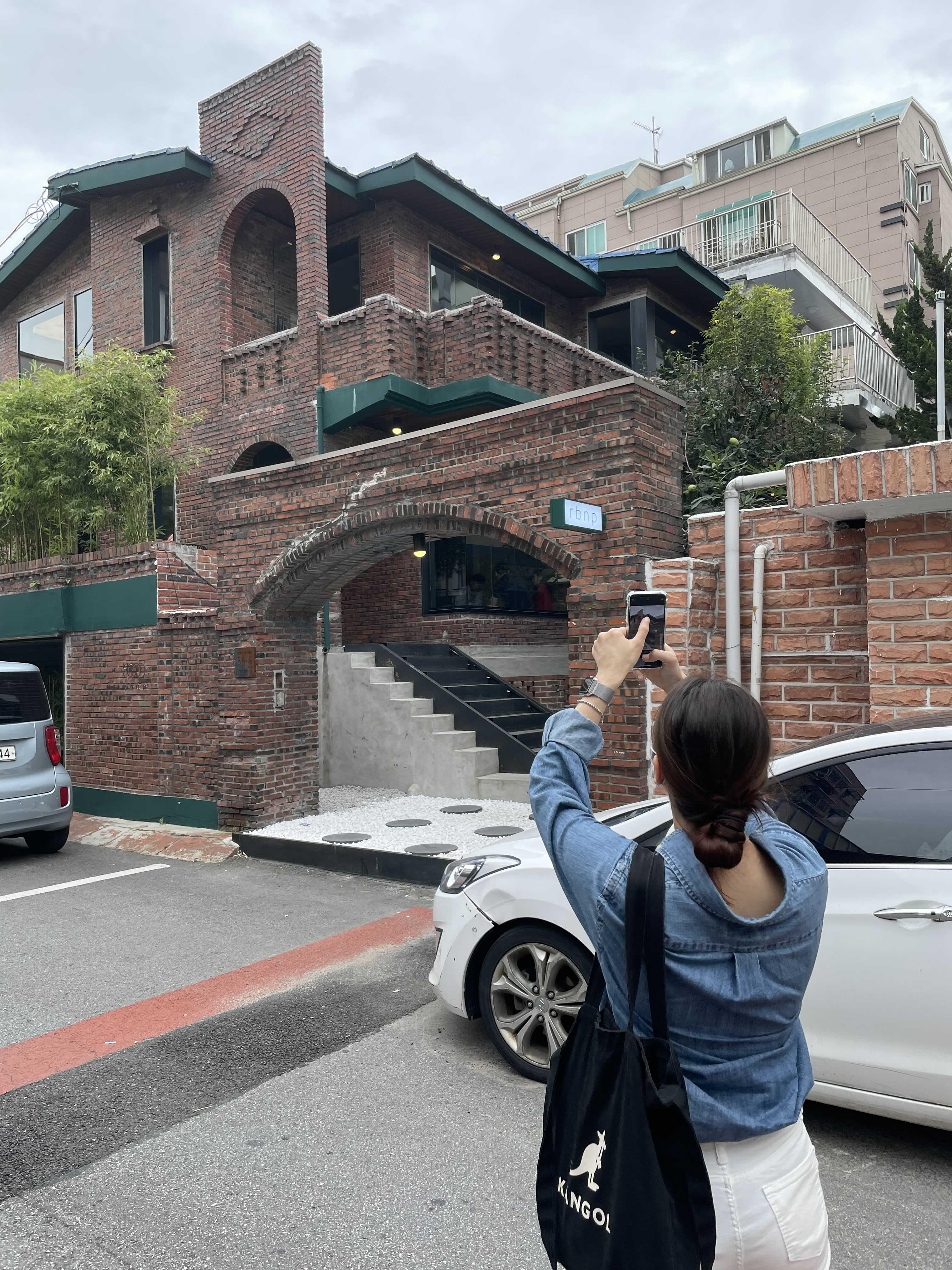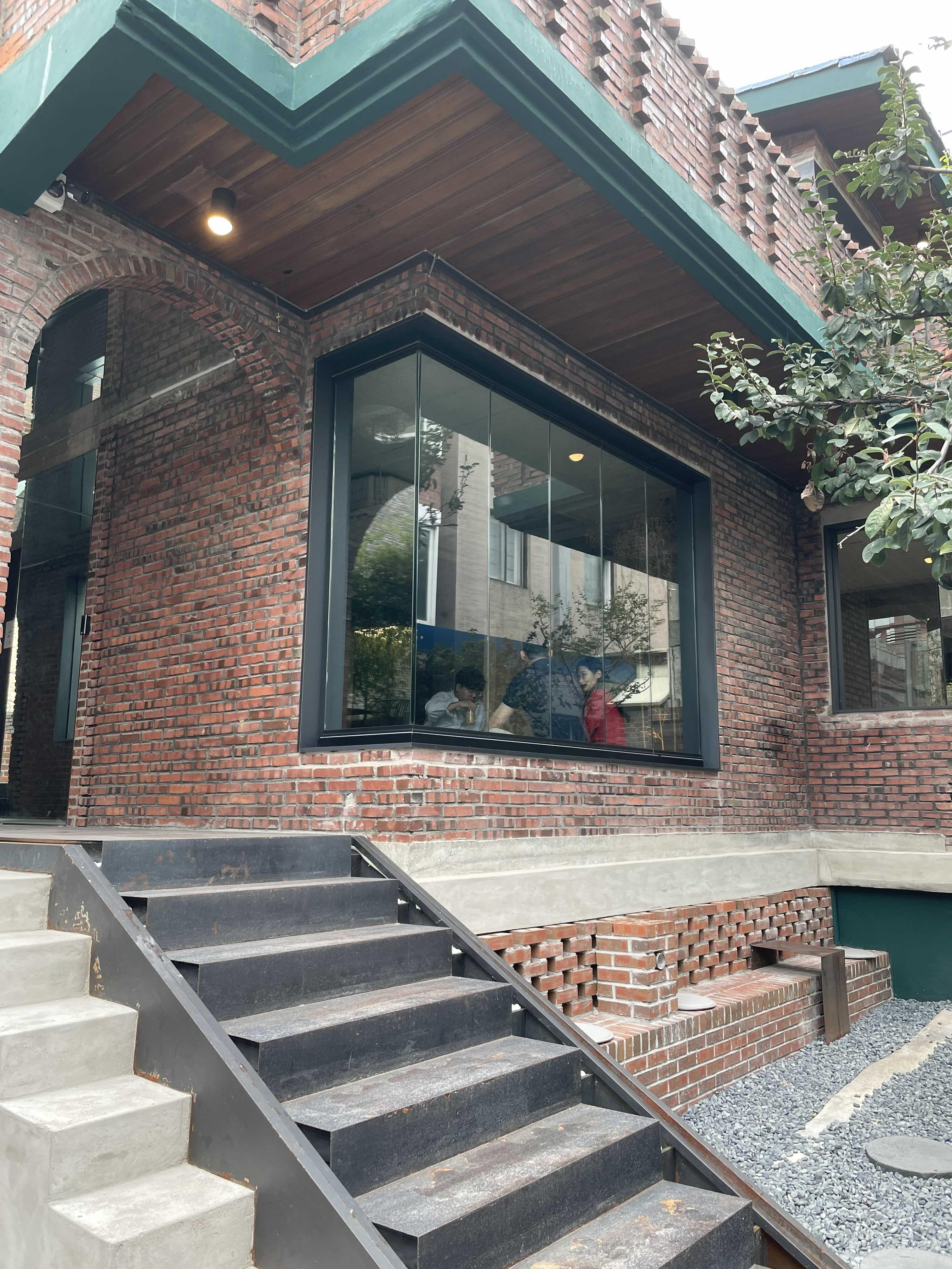 일단 카페 입구부터가 '핫플'의 냄새가 폴폴 나는 곳이다. 일단 입구에서 전체적인 모습을 사진으로 찍어보기로 했다. 아무래도 오래된 단독주택을 구매해서 개조한 것으로 보이는데, 나름 빨간색 벽돌과 초록색으로 디자인한 테두리가 잘 어울렸다.