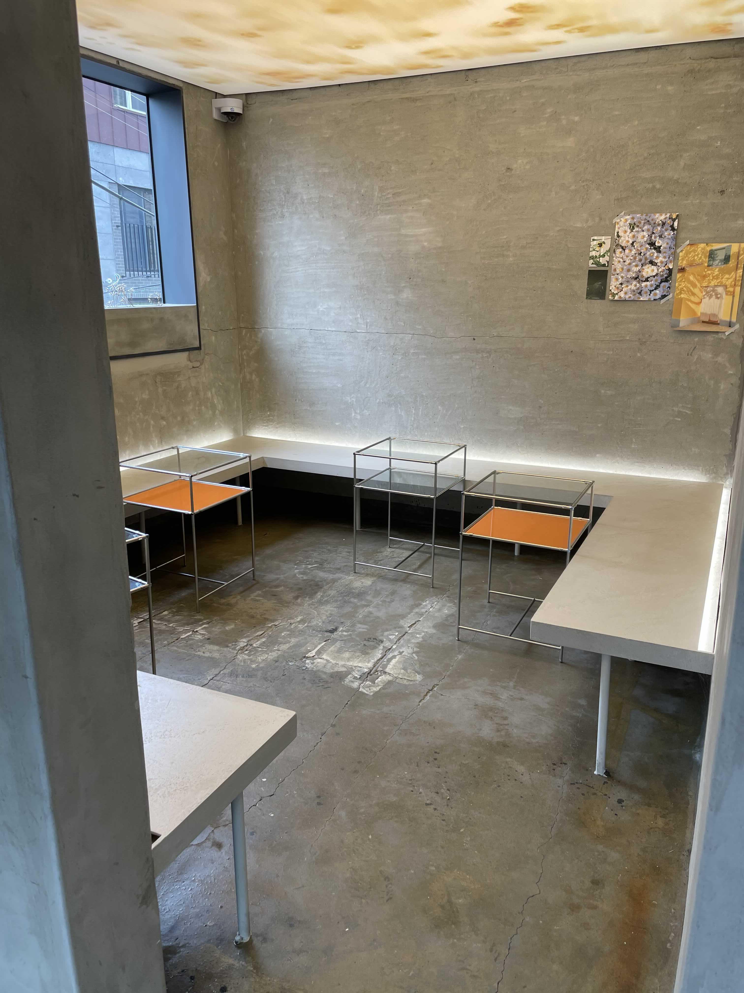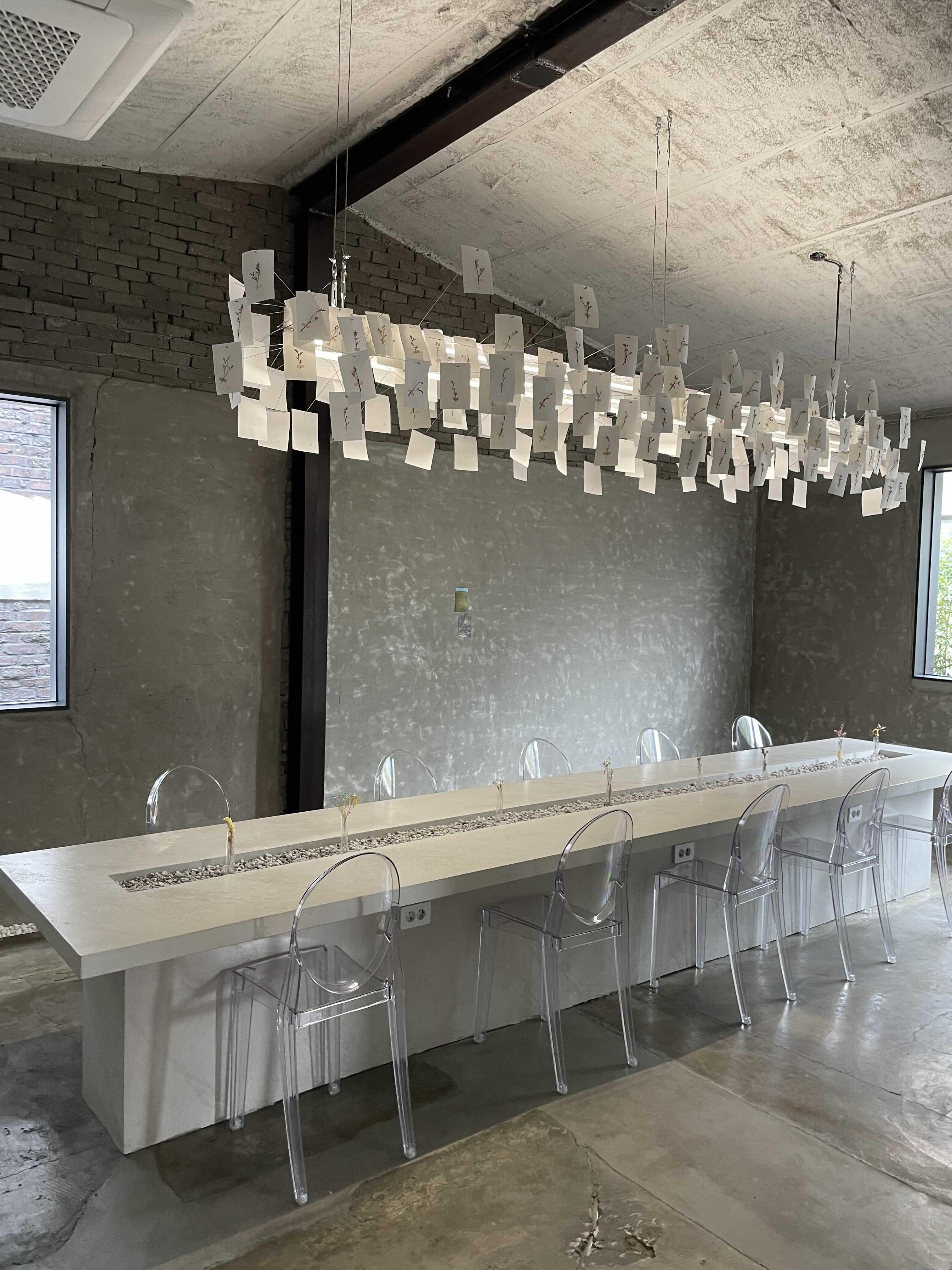 2층은 천고가 더 높았는데, 중세시대의 테이블을 연상시키는 긴 테이블과 투명한 의자, 그리고 천장에 매달려있는 종이들이 독특한 느낌을 내주었다.