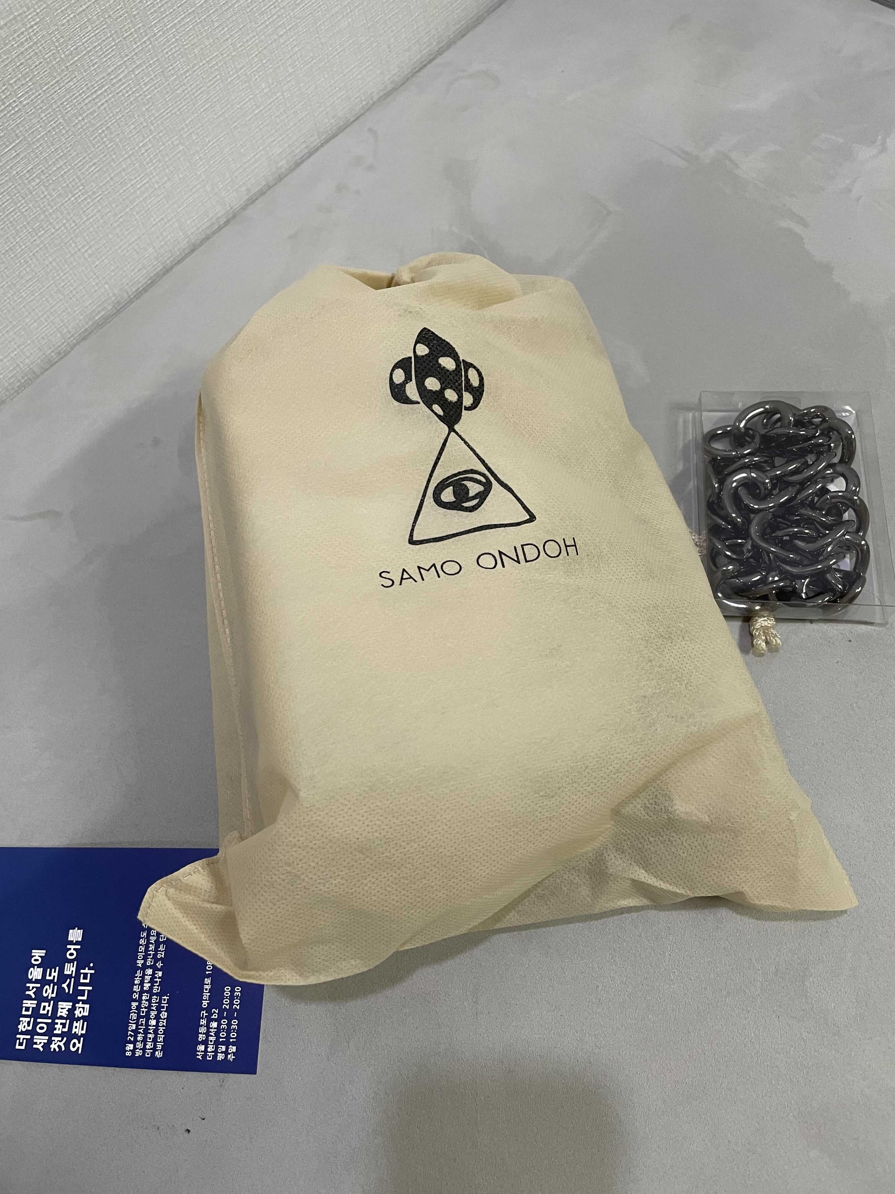 박스에서 안에 들어있는 내용물들을 모두 꺼내놓고 사진을 찍어보았다. 구성품은 더스트백, 본품, 추가로 주문한 체인, 그리고 더 현대 서울의 오프라인 매장소식이 그 구성품이다.