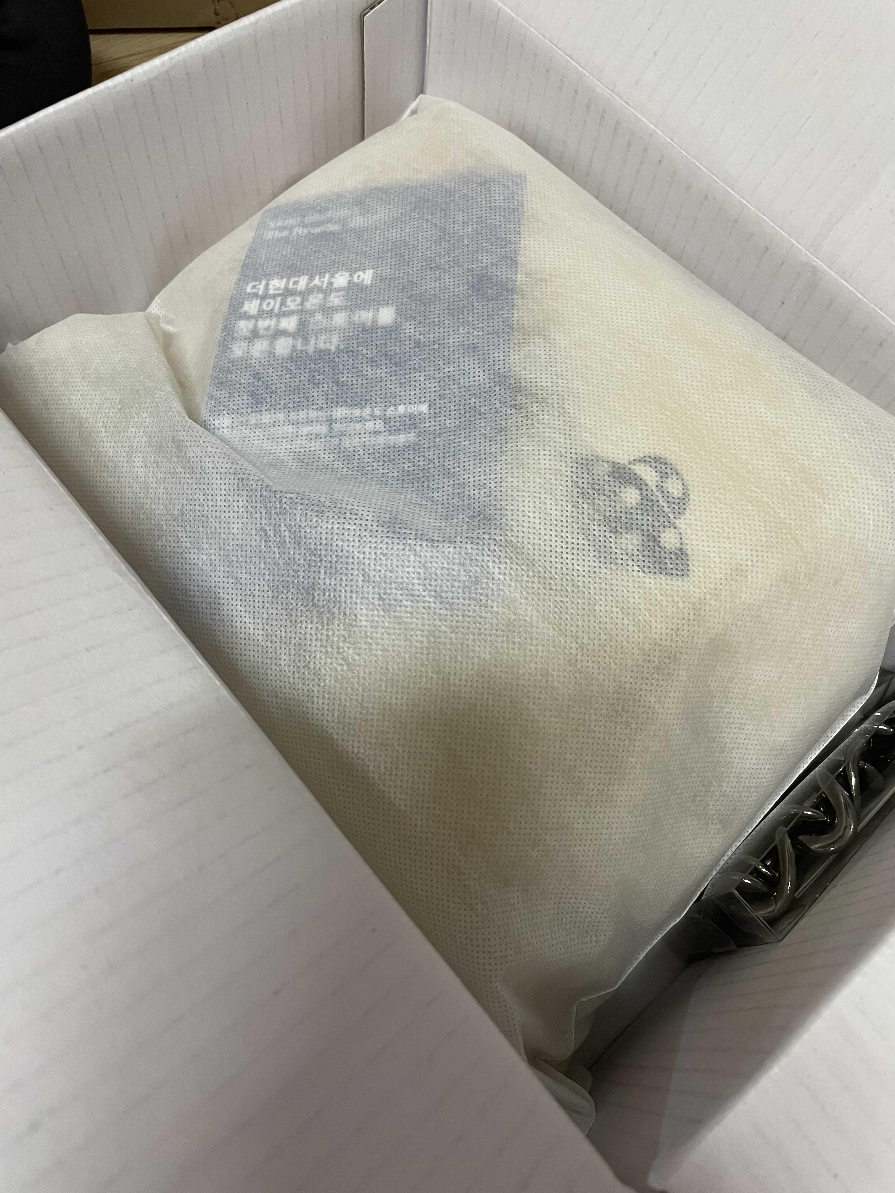 박스에서 안에 들어있는 내용물들을 모두 꺼내놓고 사진을 찍어보았다. 구성품은 더스트백, 본품, 추가로 주문한 체인, 그리고 더 현대 서울의 오프라인 매장소식이 그 구성품이다.