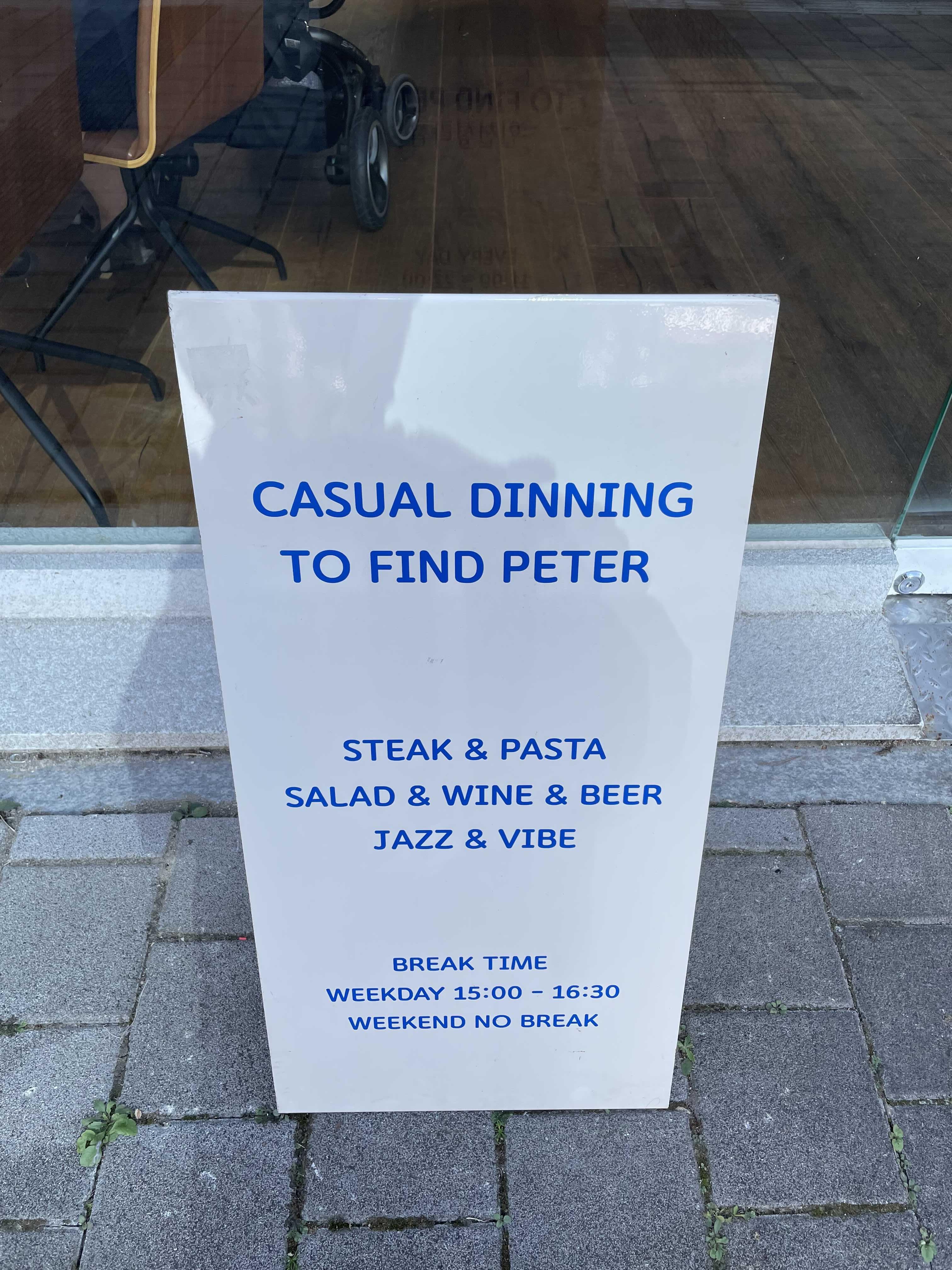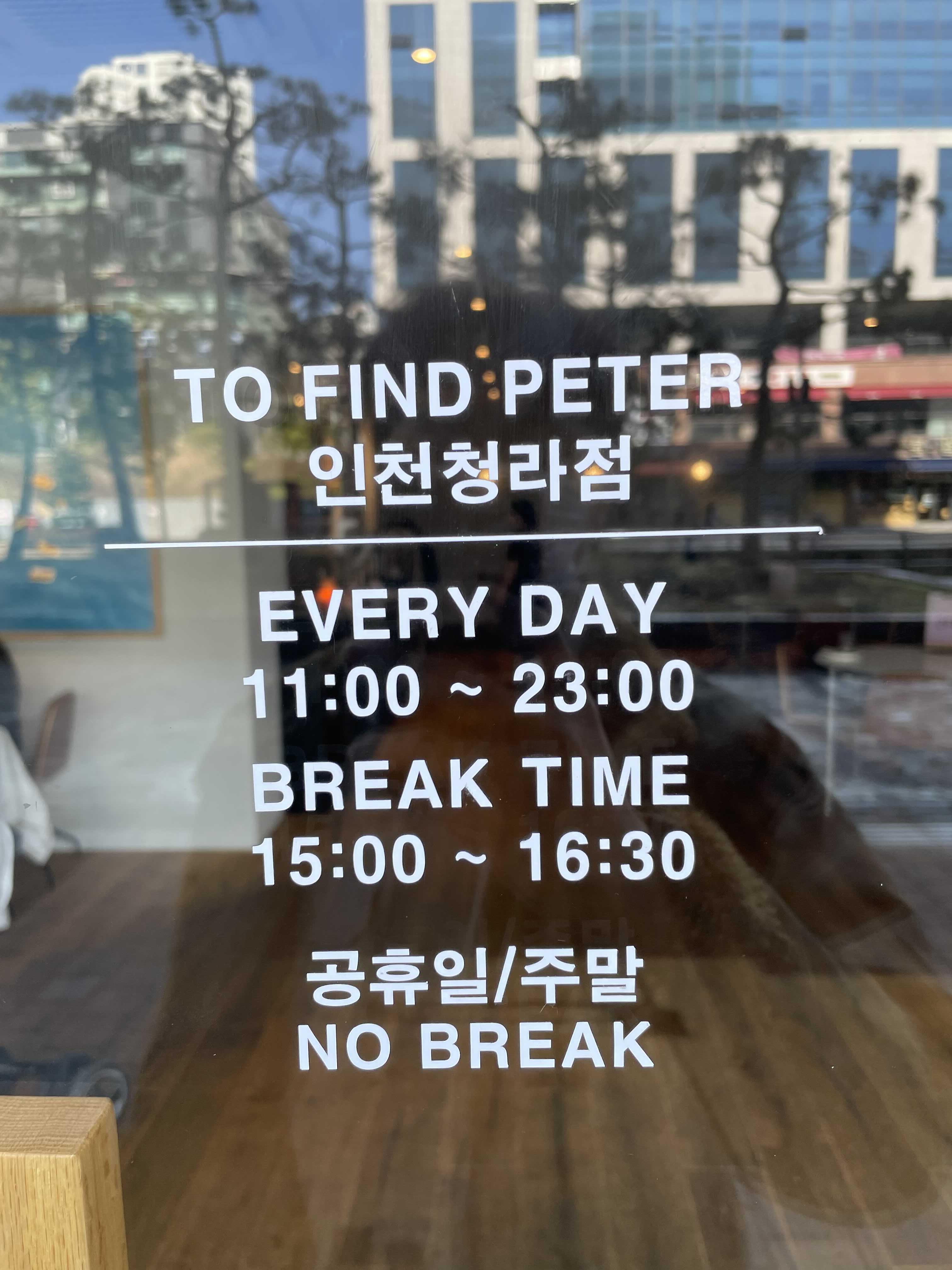 투파인드피터의 운영시간은 매일 오전 11시부터 저녁 11시까지이며, 브레이크 타임이 매일매일 존재하는데 오후 3시부터 4시 30분까지 1시간 30분 동안은 직원들의 휴식과 재료 준비를 위해서인지 브레이크 타임을 가지고 있다.