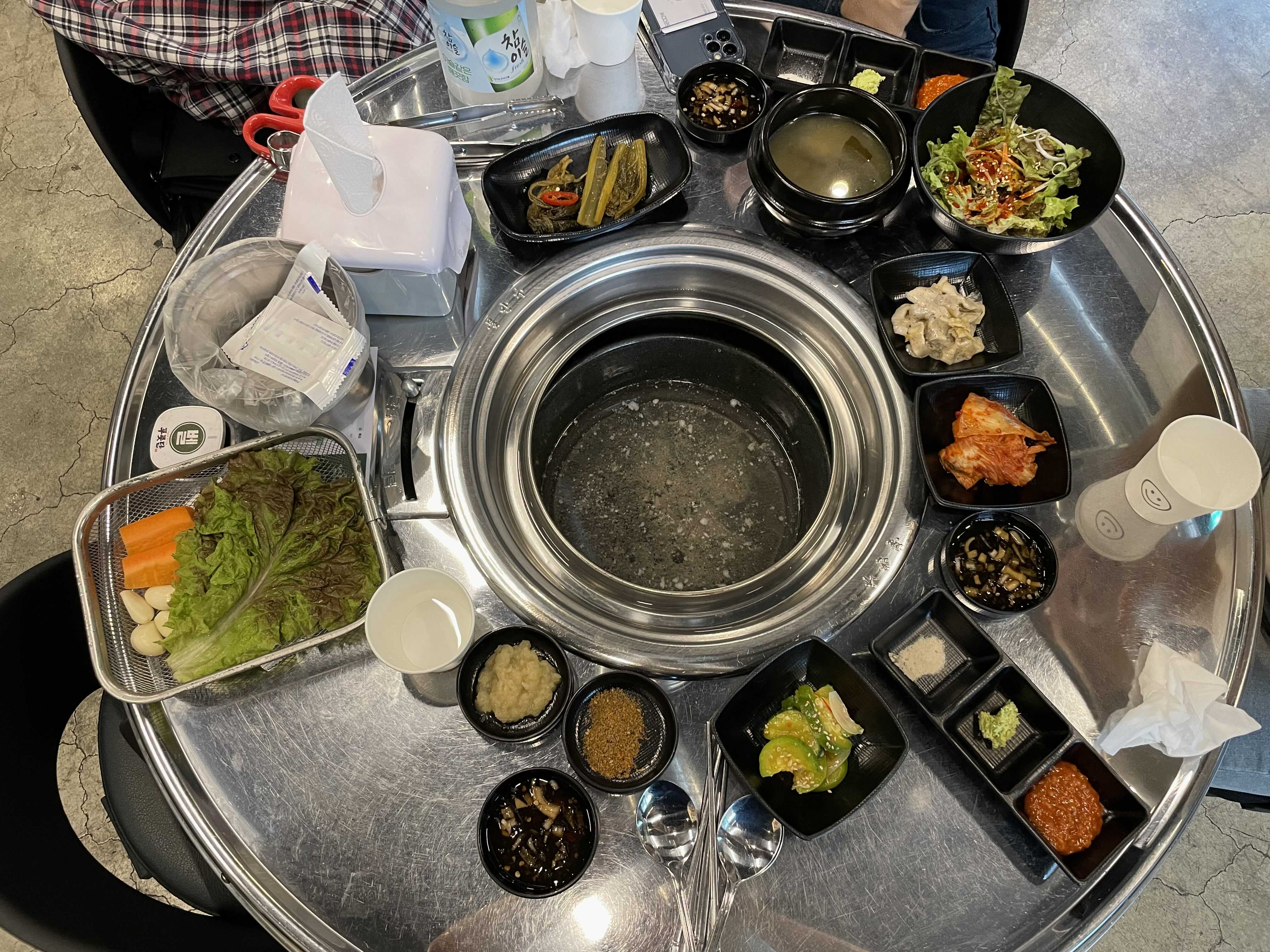 푸줏단에서 우리가 주문한 고기들이 나왔다. 고사리와 꽈리꼬추 그리고 새송이버섯도 함께 나왔는데, 같이 구워먹으니 꿀맛이었다.