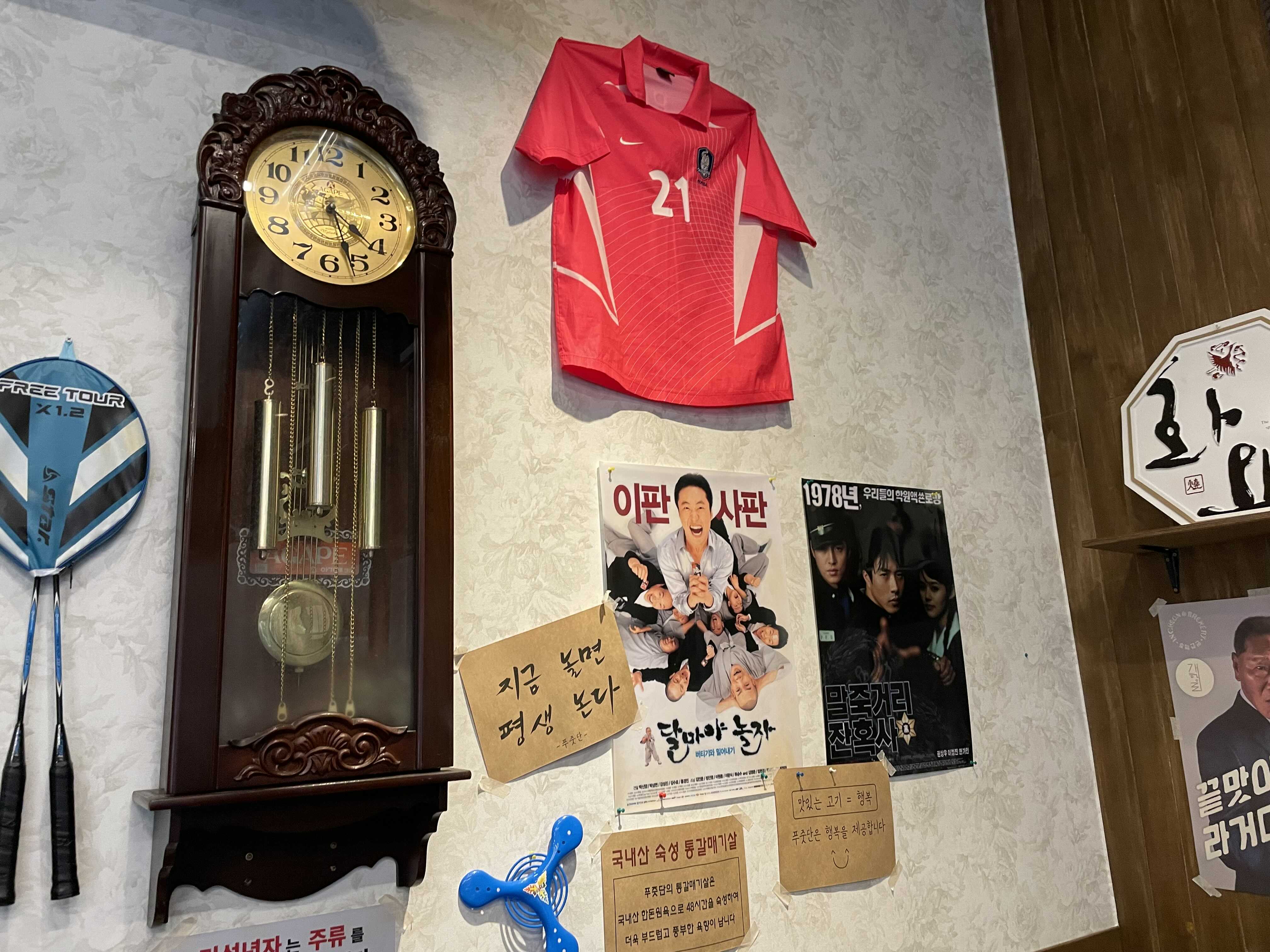 푸줏단에 방문해서 가장 재미있었던 것들은 바로 옛날 소품들이 잔뜩 벽 한쪽을 채우고 있었다는 것이다. 정우성의 모토롤라 스타택 광고부터 시작해서 '달마야 놀자' 포스터, 태극전사들의 유니폼 등등.. 사진만 찍었다하면 다시 2000년대 초반으로 돌알갈 수 있는 조건들을 가득 채우고 있었다.