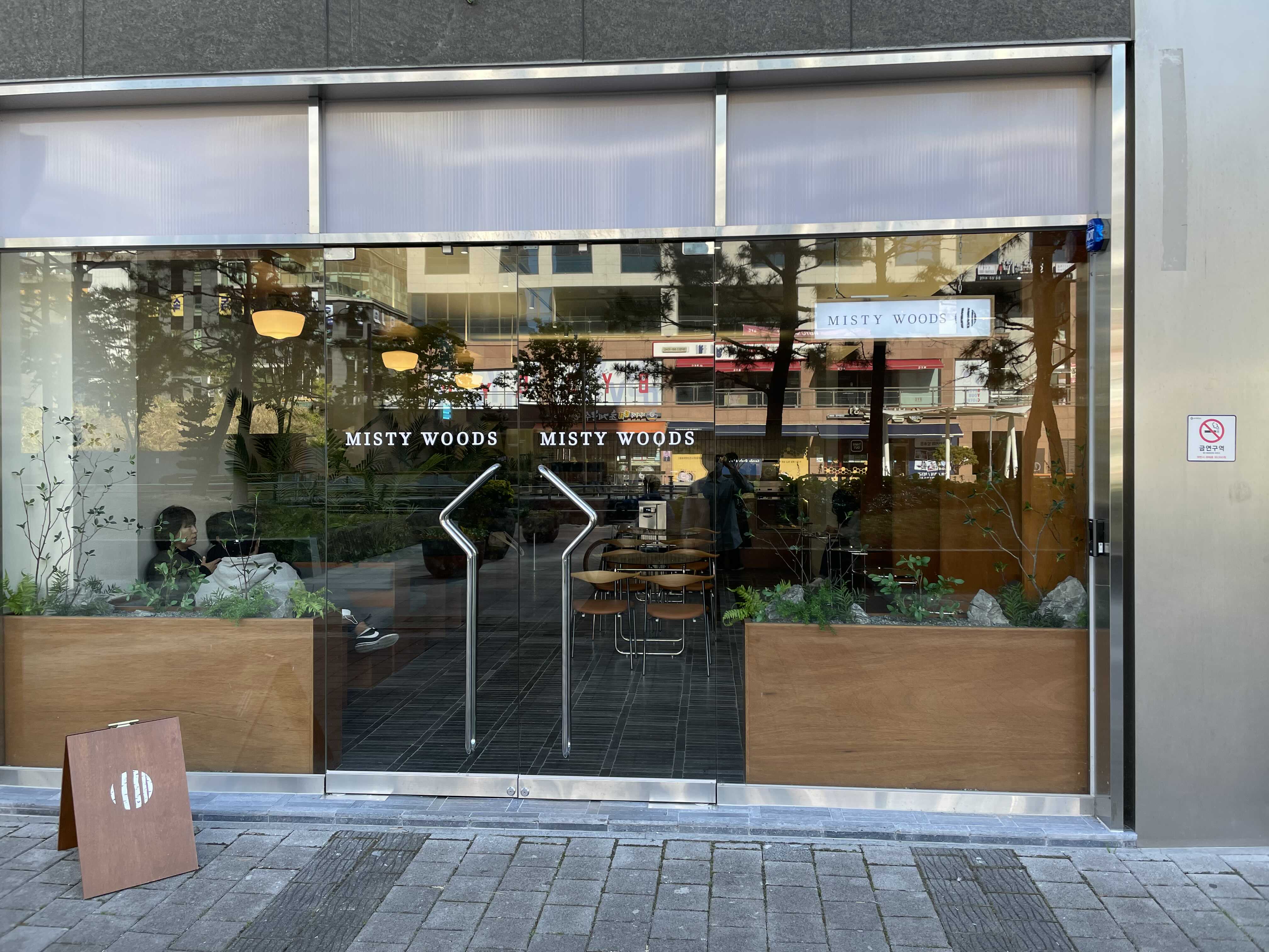 일단 밖에서 보기에도 카페 입구에 브라운톤의 화단과 그 화단에 심어진 녹색식물들이 우리의 시선을 끌었다. 요즘 노출 콘크리트 기법을 사용해서 삭막한 분위기를 내는 카페가 트렌드를 이어가고 있는 것 같은데, 미스티 우드는 전혀 그런 카페와 다른 느낌이었다.