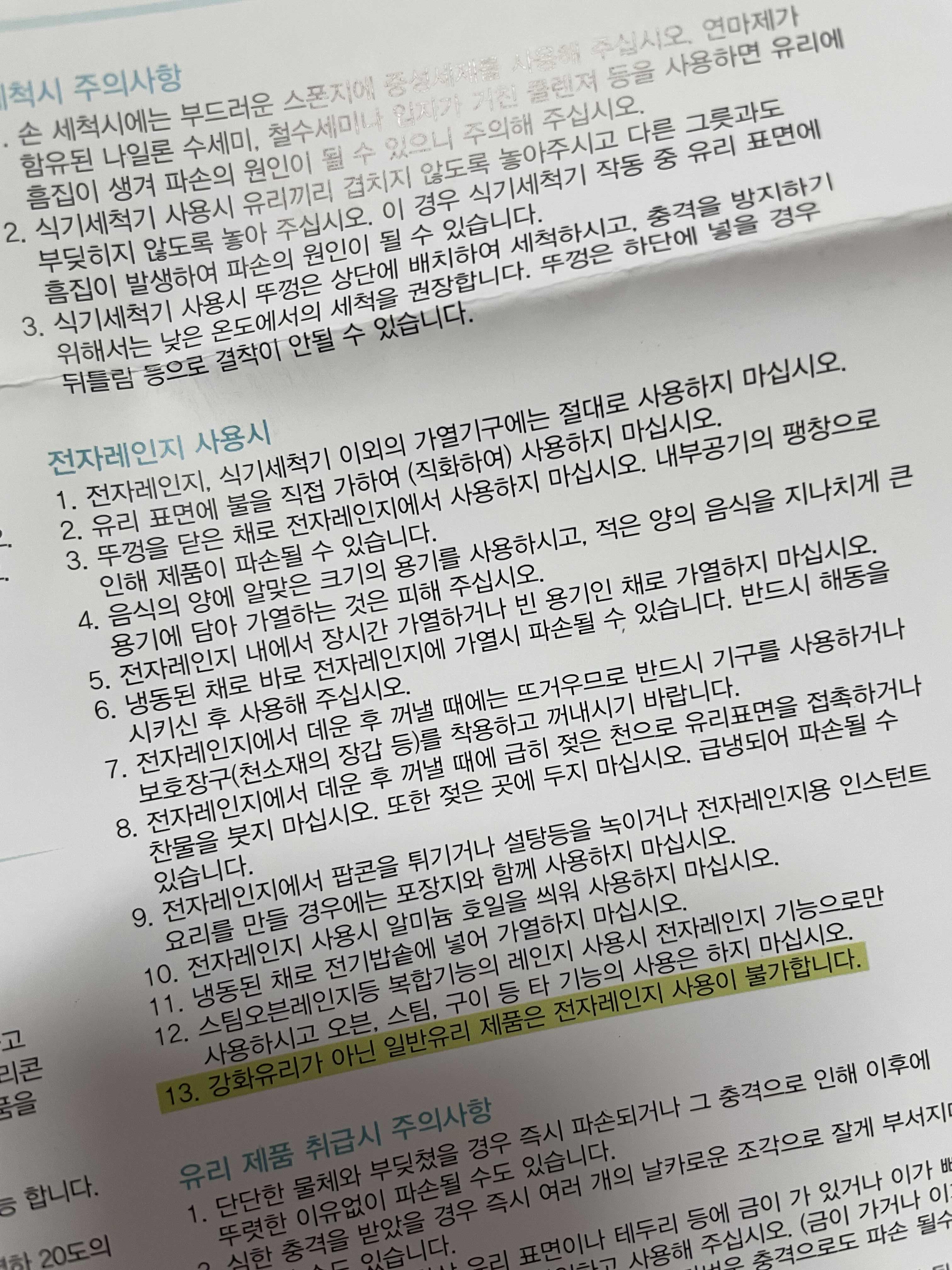 그리고 아무리 강화된 유리라고 하더라도 전자레인지에 돌릴 때 '냉동'상태에 있던 그릇 채로 전자레인지에 돌리면 그릇이 파손될 가능성이 매우 높기 때문에 해동을 거친 후에 이용하기를 바란다.