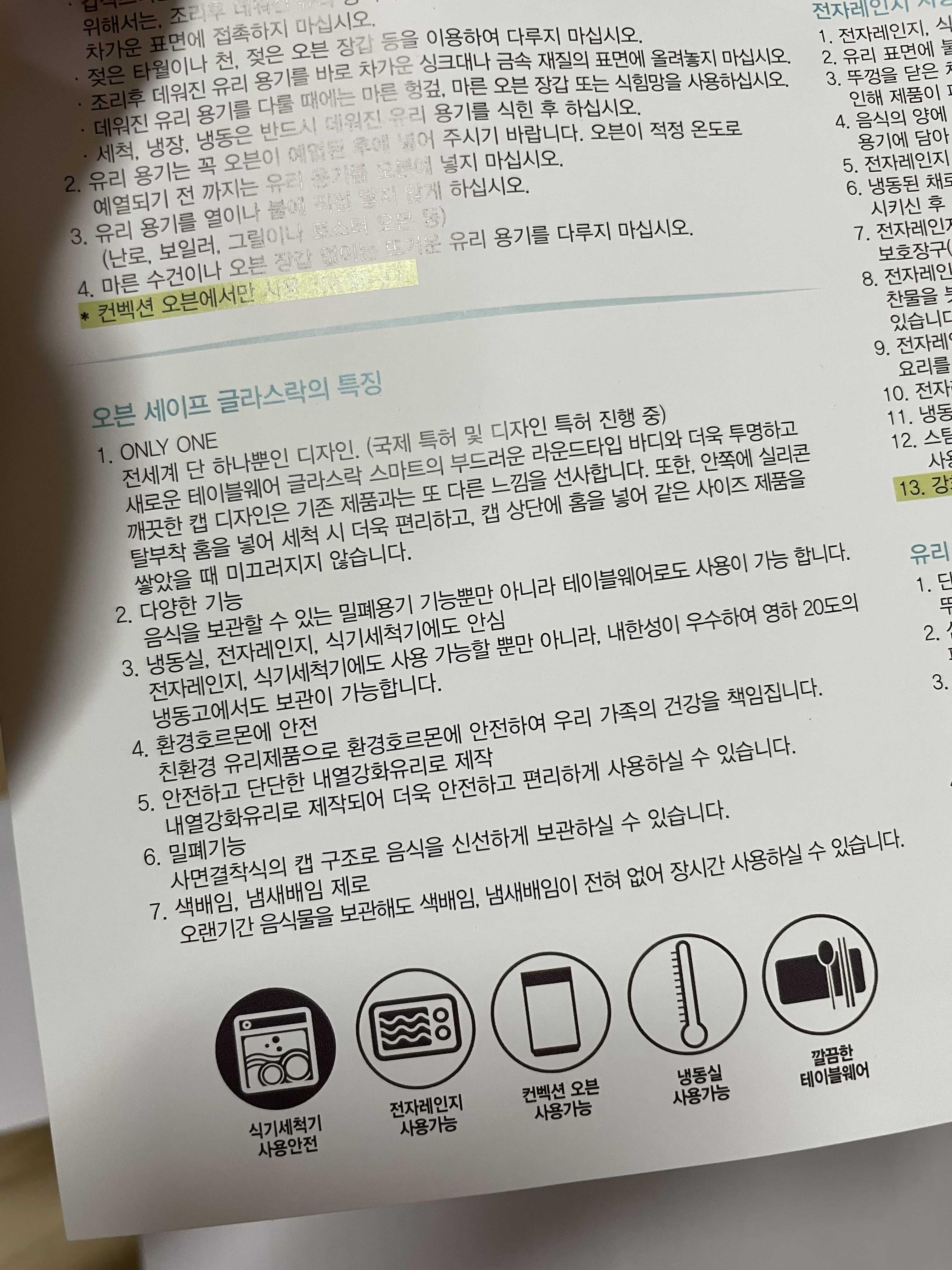 그리고 아무리 강화된 유리라고 하더라도 전자레인지에 돌릴 때 '냉동'상태에 있던 그릇 채로 전자레인지에 돌리면 그릇이 파손될 가능성이 매우 높기 때문에 해동을 거친 후에 이용하기를 바란다.