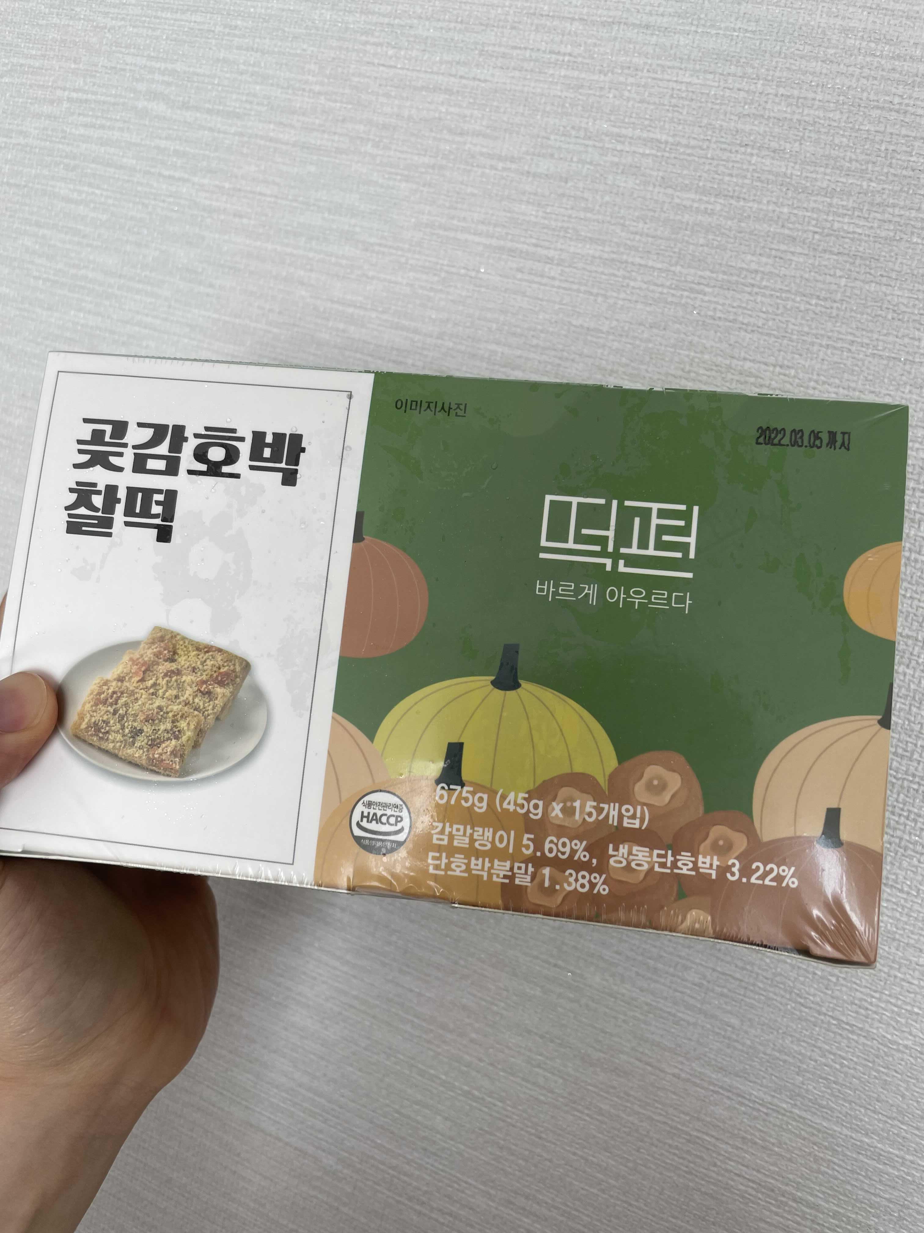 일단 맛은 호박향이 약하게 나는데, 실제로 떡 안에 곶감이 들어있고, 그걸 씹으면 곶감과 호박의 맛이 어우러지면서 자연스러운 단맛을 냈다. 자극적으로 달지도 않고, 인위적인 단맛이 나지도 않았다. 후기가 왜 많은지도 알 수 있었고, HACCP 인증을 받은 곳에서 만들었다고 하니 안심하고 먹을 수 있는데다가 개별적으로 하나씩 포장되어 있어서 꺼내먹기도 매우 편했다.