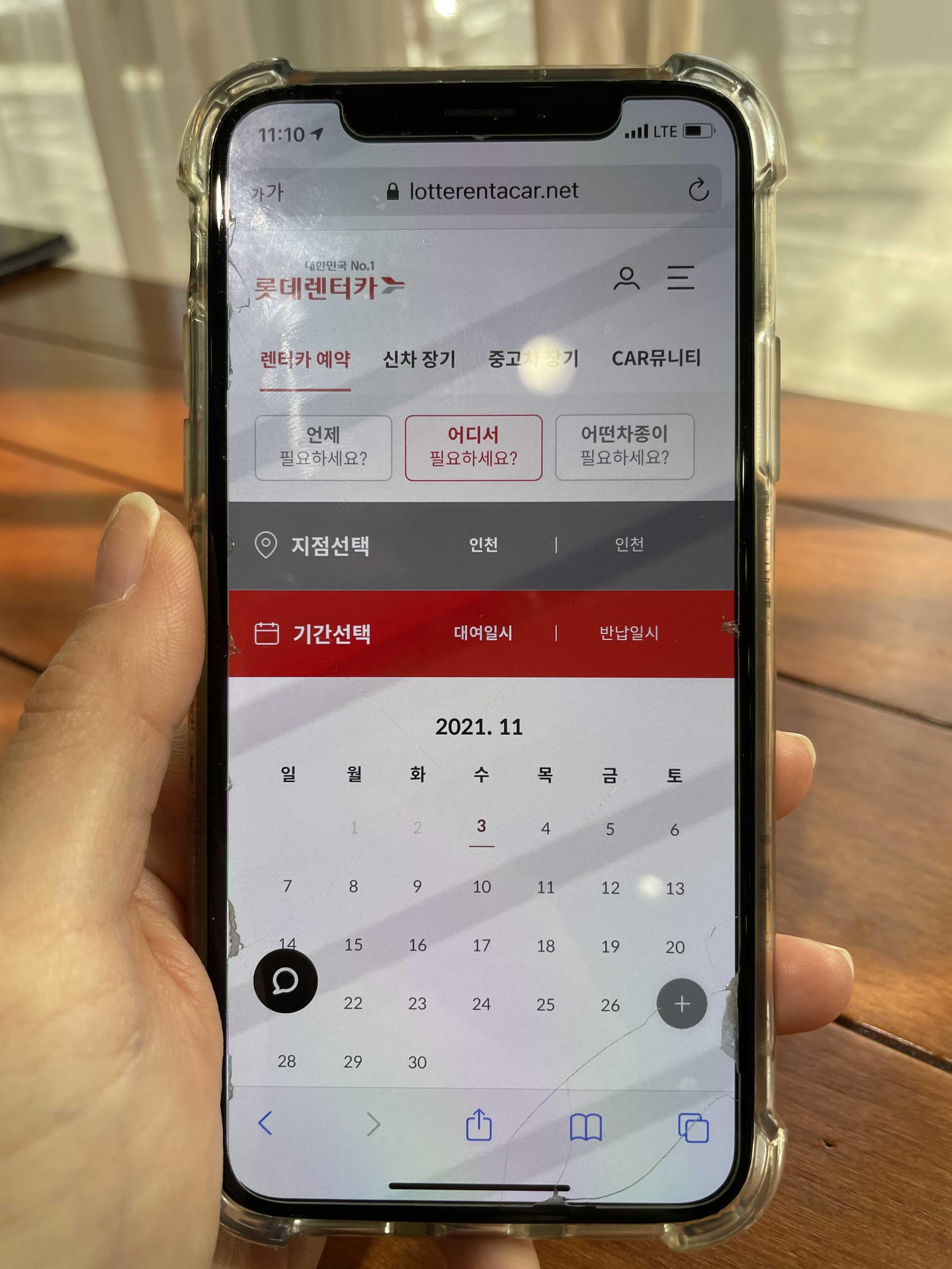 롯데렌터카의 장점이라 하면, 어플로 쉽고 간단하게 예약할 수 있다는 것 같다. 나는 이런 어플로 예약하고 결제하는 것에 익숙하지 않음에도 쉽게 할 수 있었다. 먼저 원하는 날짜를 선택한다.