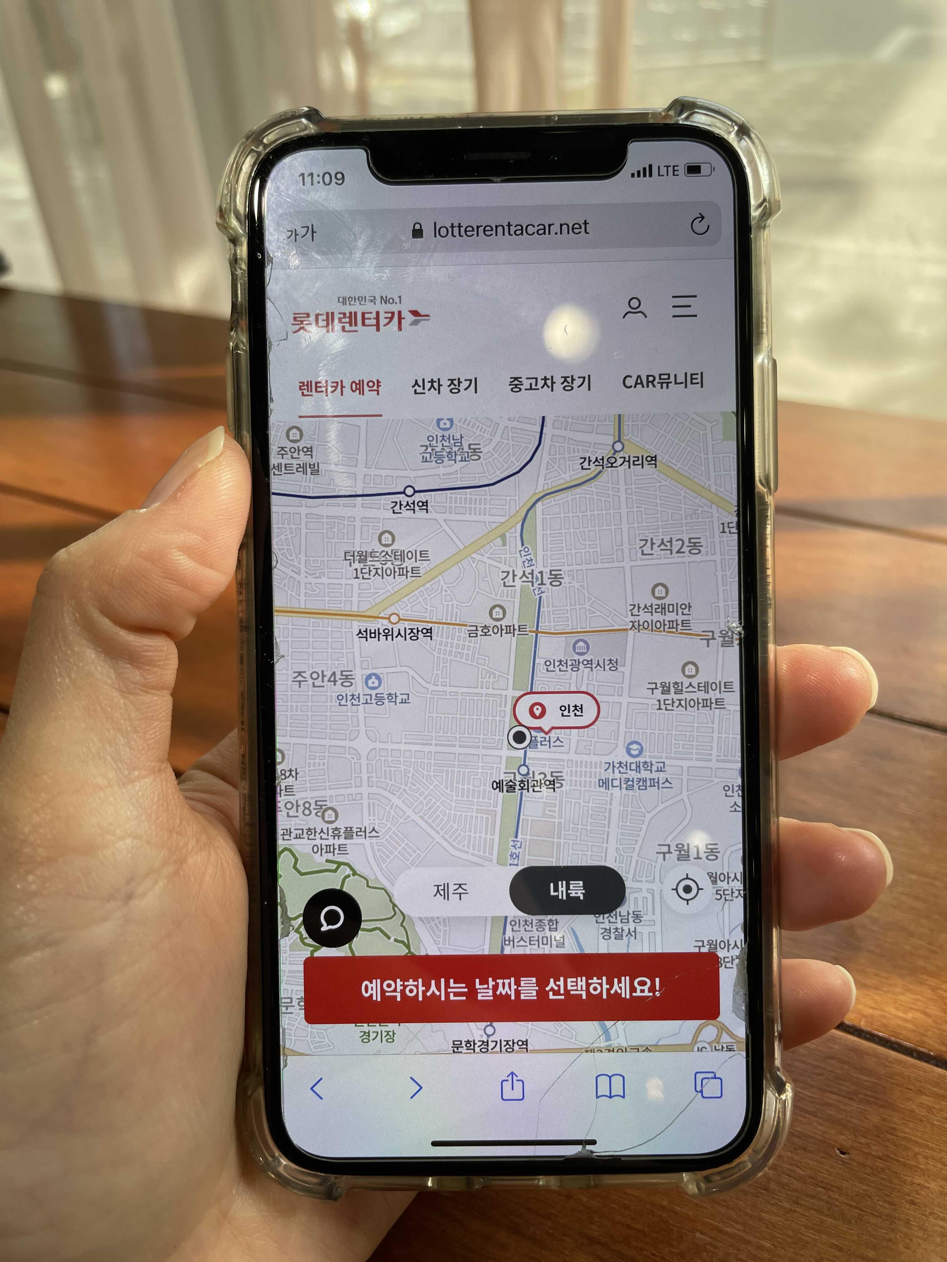 롯데렌터카의 장점이라 하면, 어플로 쉽고 간단하게 예약할 수 있다는 것 같다. 나는 이런 어플로 예약하고 결제하는 것에 익숙하지 않음에도 쉽게 할 수 있었다. 먼저 원하는 날짜를 선택한다.