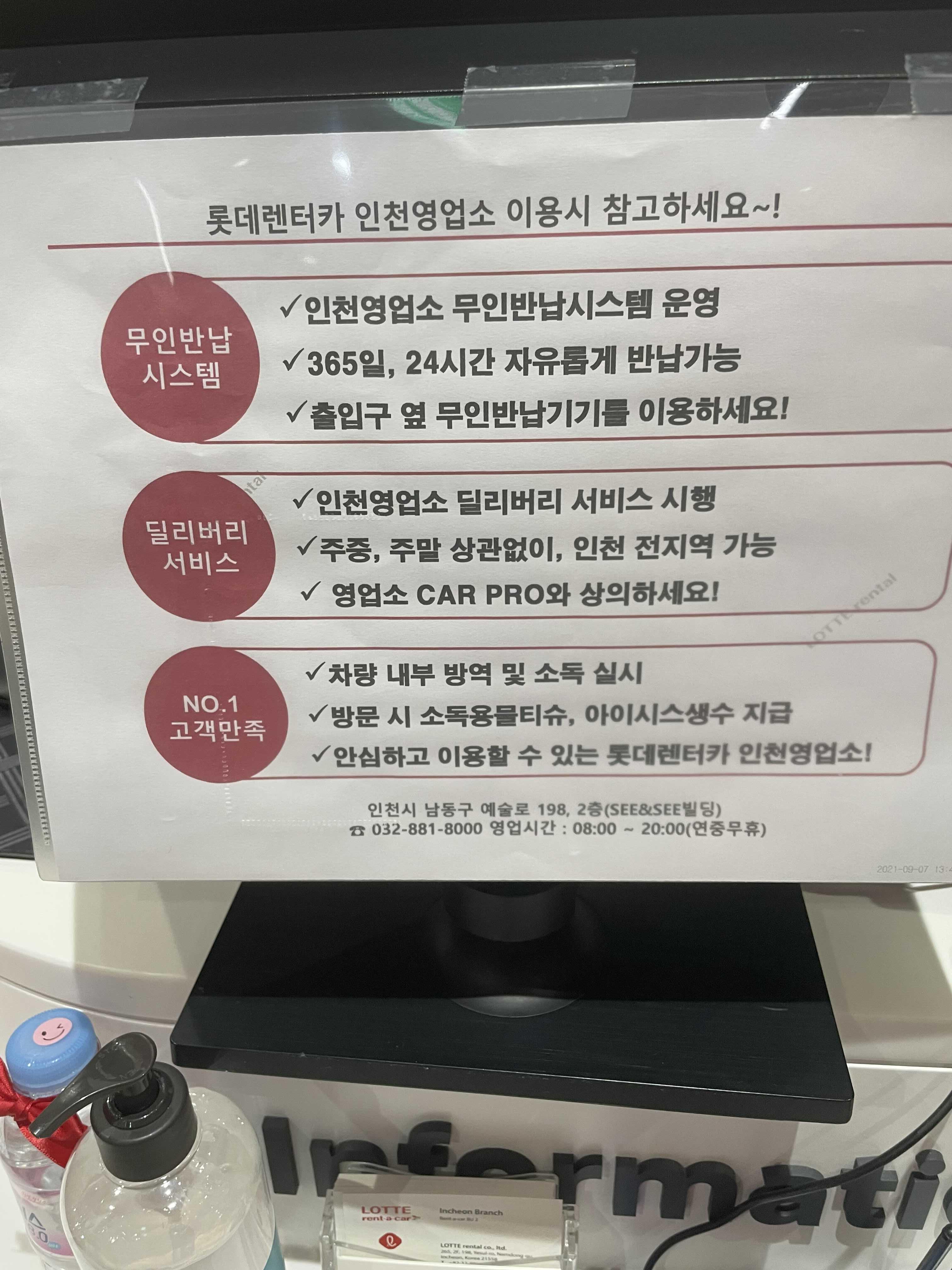또한 차량을 아주 깔끔하게 세차해놓았고, 내부 방역을 해서 그런지 좋은 향기가 차 내부에서 났다. 그리고 반납할 때도 마음에 드는 점이 있었는데 처음 렌트카를 빌릴 때 기름도 100%로 채워주고 반납시에도 엄격하게 체크하거나 하지않았고, 반납시간도 30분 까지는 오버되더라도 추가요금을 받지 않는다는 점도 좋았다. 전체적으로 매우 만족스러운 렌터카였다. 다음에 차를 빌려야 할 일이 있다면 망설이지않고 롯데렌터카 인천점을 다시 이용할 것 같다. 100% 내돈내산이며 광고가 아님을 밝힌다.