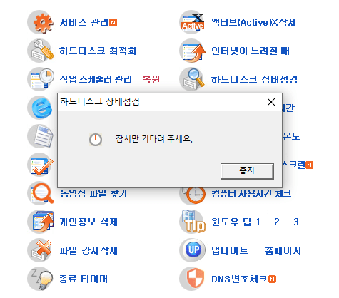 세 번째 기능은 고클린으로 하드디스크의 상태를 확인할 수 있다는 점이다. 하드디스크 상태 점검을 누르게 되면 왼쪽 상단의 사진처럼 <잠시만 기다려 주세요.>라는 메시지가 보이게 되고 시간이 조금 지나면 오른쪽 상단의 사진처럼 상태를 확인할 수 있도록 해준다. 내가 사용하는 컴퓨터의 경우는 'OK'로 다 나오는 걸 보니 하드디스크는 아직 멀쩡한 것으로 보인다.
