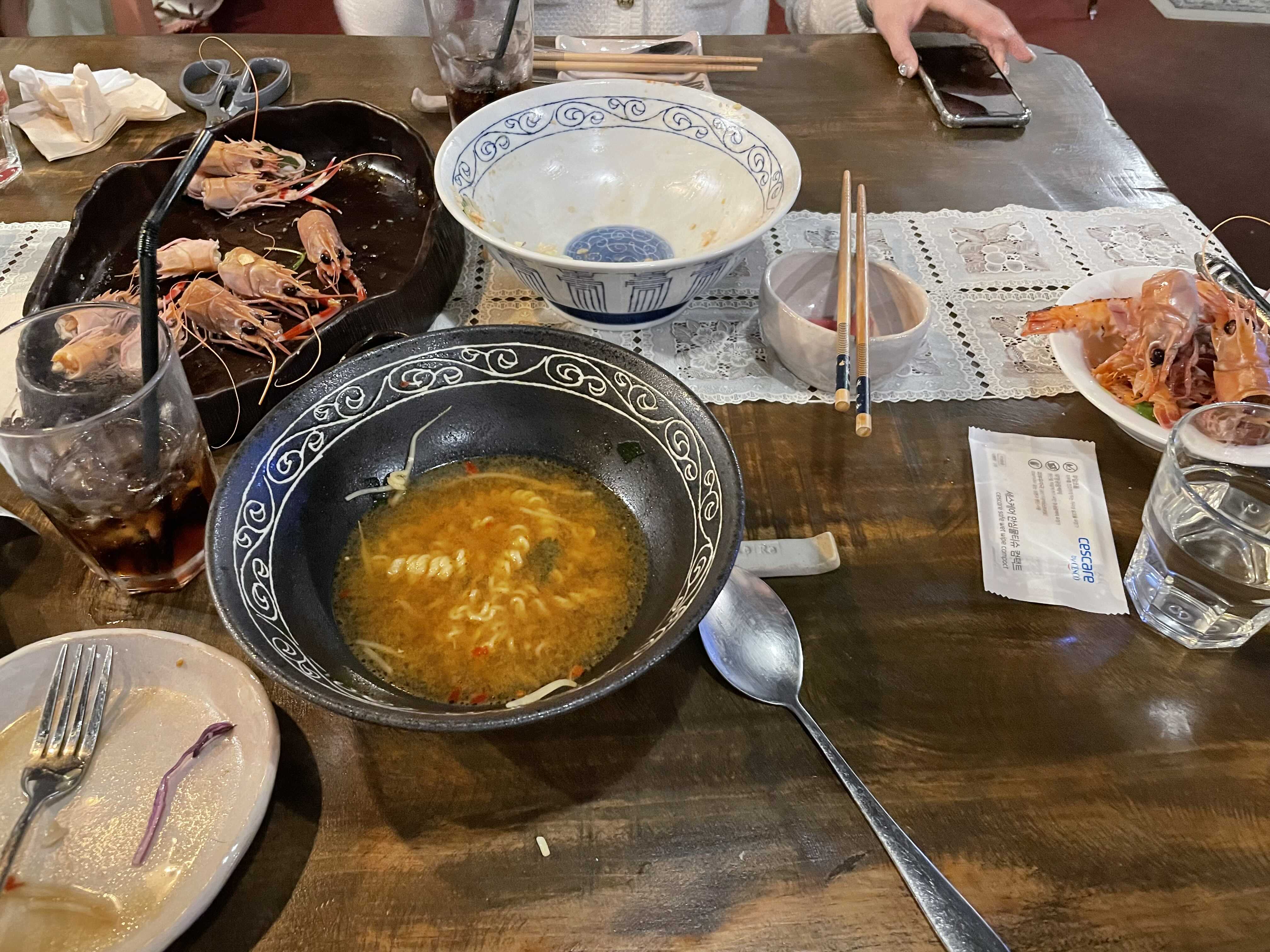 딱새우 라면은 평대 앓이의 보너스 메뉴(?)와도 같은 메뉴였는데, 사시미를 먹은 사람들에게 무료로 제공해주는 라면이었다. 그런데 나는 이 라면에 대한 기대감이 너무 컸는지, 아니면 급하게 끓이시느라 그랬는지, 라면 국물에서 해산물의 향이 전혀 올라오지 않았다. 뭔가 라면 끓인 뒤에 딱새우 머리만 넣어서 데코레이션 한듯한 가벼운 맛이랄까? 내 여자 친구는 그냥 일반 라면과 맛이 크게 다르지 않다고 하기도 했다. 하지만 뭐 돈을 지불하지 않고 먹은 보너스 메뉴니까 이 정도면 충분히 만족한다.
