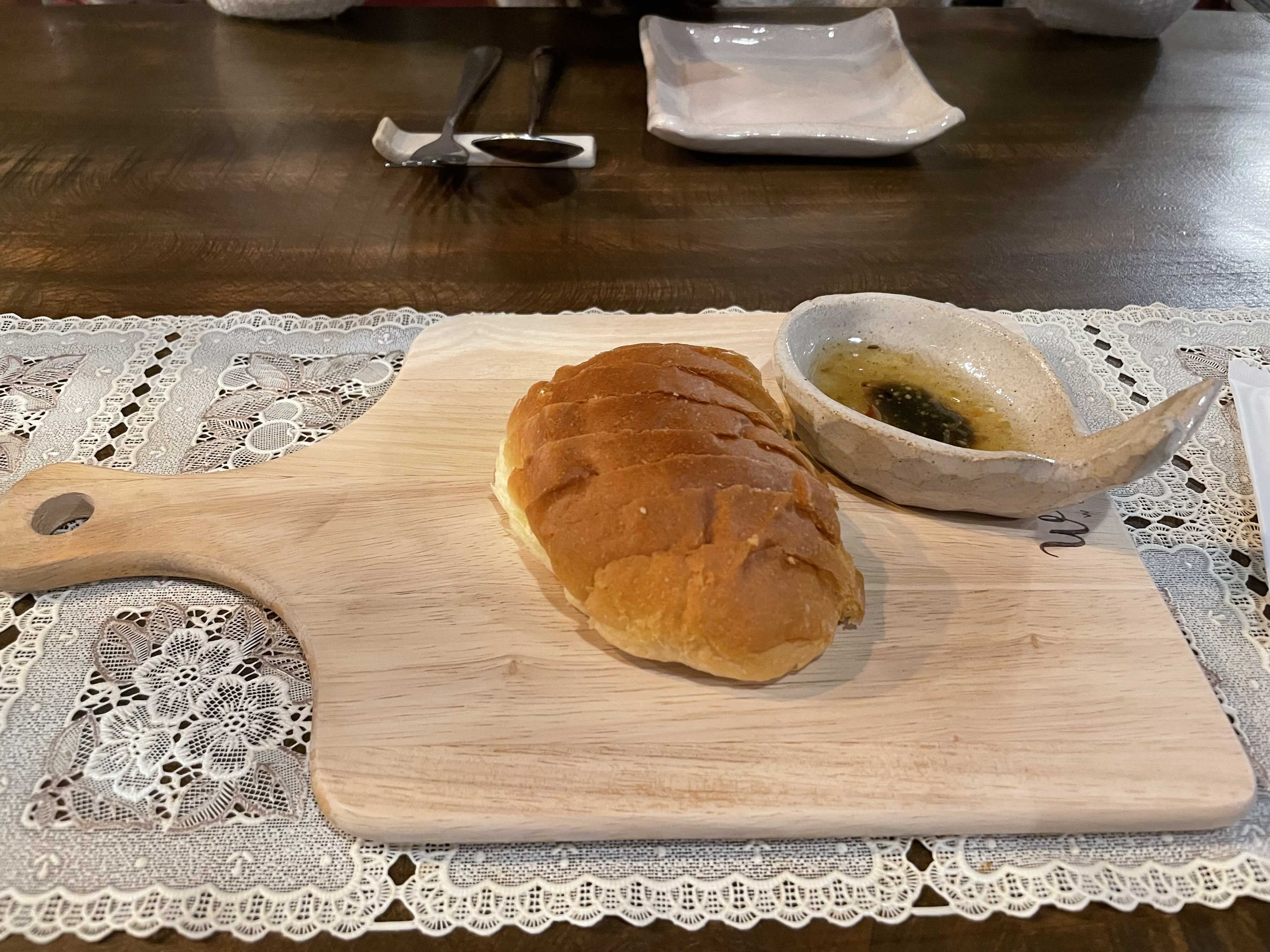 일단 우리가 자리에 앉자마자 바로 식전 빵이 준비돼서 나왔다. 식전 빵은 그냥 모닝빵을 살짝 구워서 내어준 그냥 모닝빵 맛이었다. 뭐 특별한 건 없었고, 다만 발사믹 소스가 맛있어서 여자 친구가 다 먹었다.