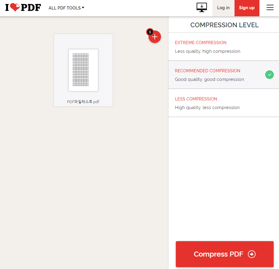 사이트에 파일을 드래그하거나 첨부해서 위와 같은 화면이 나오면 왼편에 압축을 얼마나 할 것인지를 자신이 선택할 수 있도록 해준다. 익스트림하게 극단적으로 용량을 줄이는 것과 보통 그리고 비교적 적게(?)줄이는 방법이 있다.