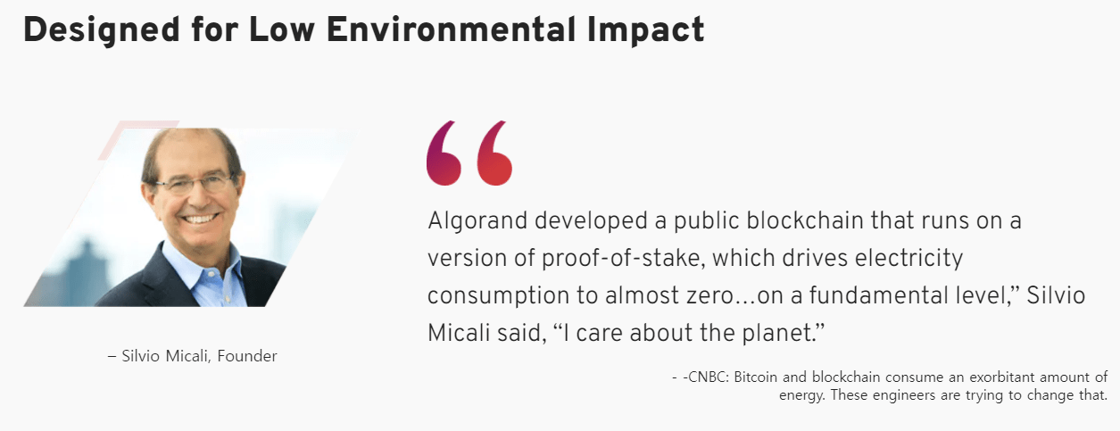 알고랜드를 만든 '실비오 미칼리'교수는 미국의 유명한 공과대학인 MIT의 명예교수이며 암호학과 관련하여 다양한 분야에서 세계적 성과를 거둔 사람이다. 또한 암호학에 대한 성과들로 인해 컴퓨터 공학계의 '노벨상'이라고 불리는 튜링상을 수상했다. 그렇기에 암호화에는 알고랜드가 강력할 수밖에 없는 것이다. 게다가 노벨 경제학상을 수상한 폴 밀 그롬 교수가 알고랜드 네트워크의 자문위원으로 있고, 전 세계의 암호화폐 학계로부터 전폭적인 백업을 받으면서 알고랜드 자체 네트워크를 점차 확장시켜가고 있는 중이다. 또한 지분 증명 방식을 사용하는 알고랜드는 전기 소모량을 거의 제로에 가깝게 줄였다고 이야기한다. 이런 부분에서 알고랜드가 차세대 스마트 컨트랙트 플랫폼으로 많은 관심을 받을 것으로 보인다.