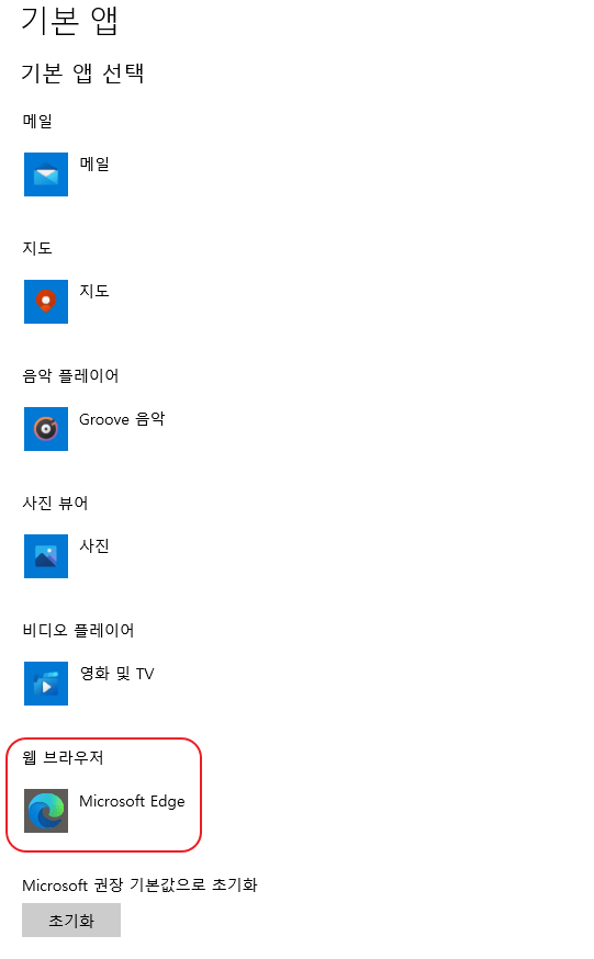 기본앱을 클릭해주면 아래와 같은 사진이 나올 것이고, 각종 응용프로그램을 작동시킬 때마다 기본적으로 켜지는 '앱'들을 내가 직접 설정할 수 있을 것이다. 그중에서 우리는 '웹브라우저'를 변경시킬 것이고 지금 상태를 확인해보면 <Microsoft Edge>라고 쓰여있는 것이 보일 것이다. 지금부터 여기를 바꿔주면 기본 브라우저가 변경되는 것이다.