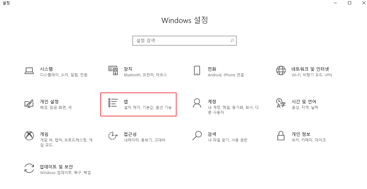 기본 브라우저를 변경하기 위해서는 가장 먼저 시작 메뉴를 열고 <설정>을 켜줘야 하는데, 설정이 어디있는지 모른다면 윈도우 좌측 하단에 있는 '검색하려면 여기에 입력하십시오.'라고 쓰인 곳에 <설정>이라고 검색을 해주고 맨 위에 나오는 메뉴를 클릭해준다. 그러면 아래와 같은 <Windows 설정> 창이 뜰 것이다.