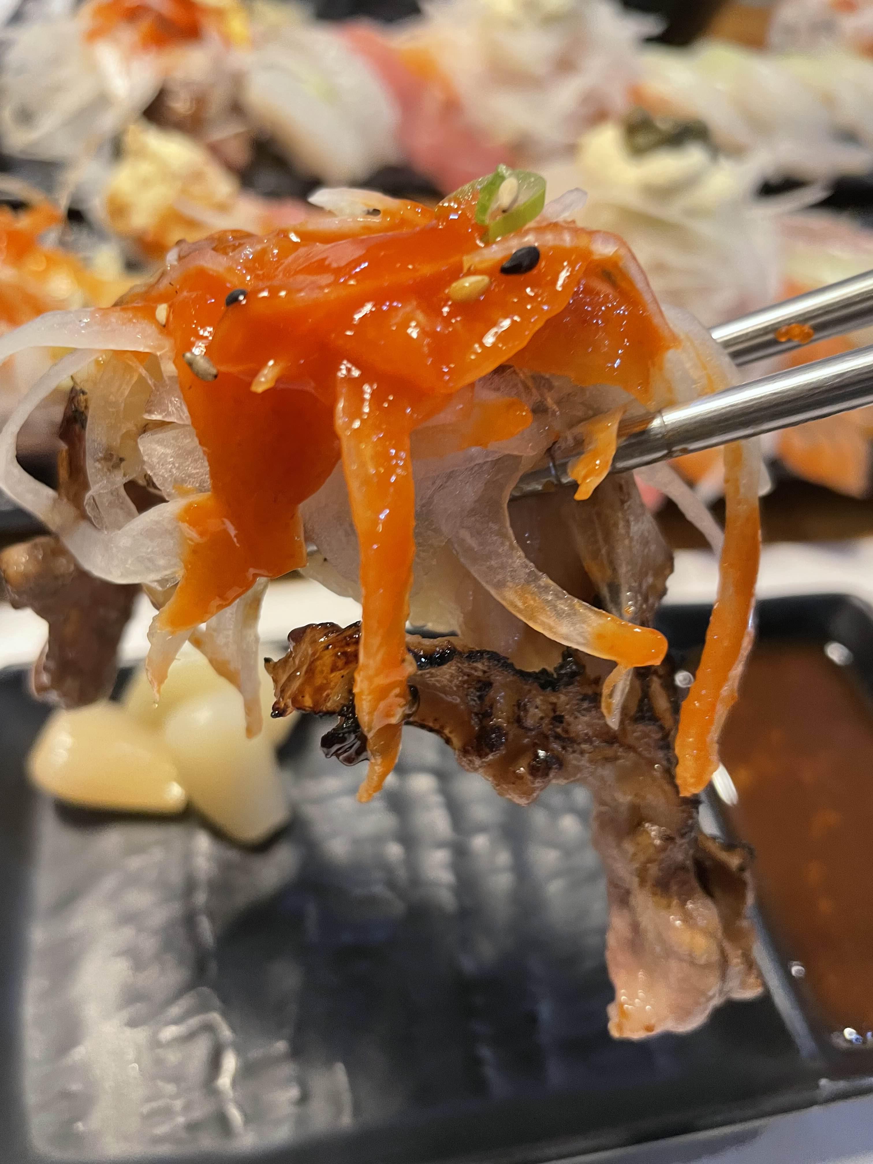 소고기로 초밥을 만들어주셨는데, 아무래도 해산물이 아니라 소고기로 만들어서 이질감이 있을 줄 알았는데, 생각보다 무지 잘 어울렸고, 양파 위에 올라간 고추장? 칠리? 소스와도 조화가 적절했다. 소고기는 질기지 않았고 부드러워서 먹기에 알맞았다.