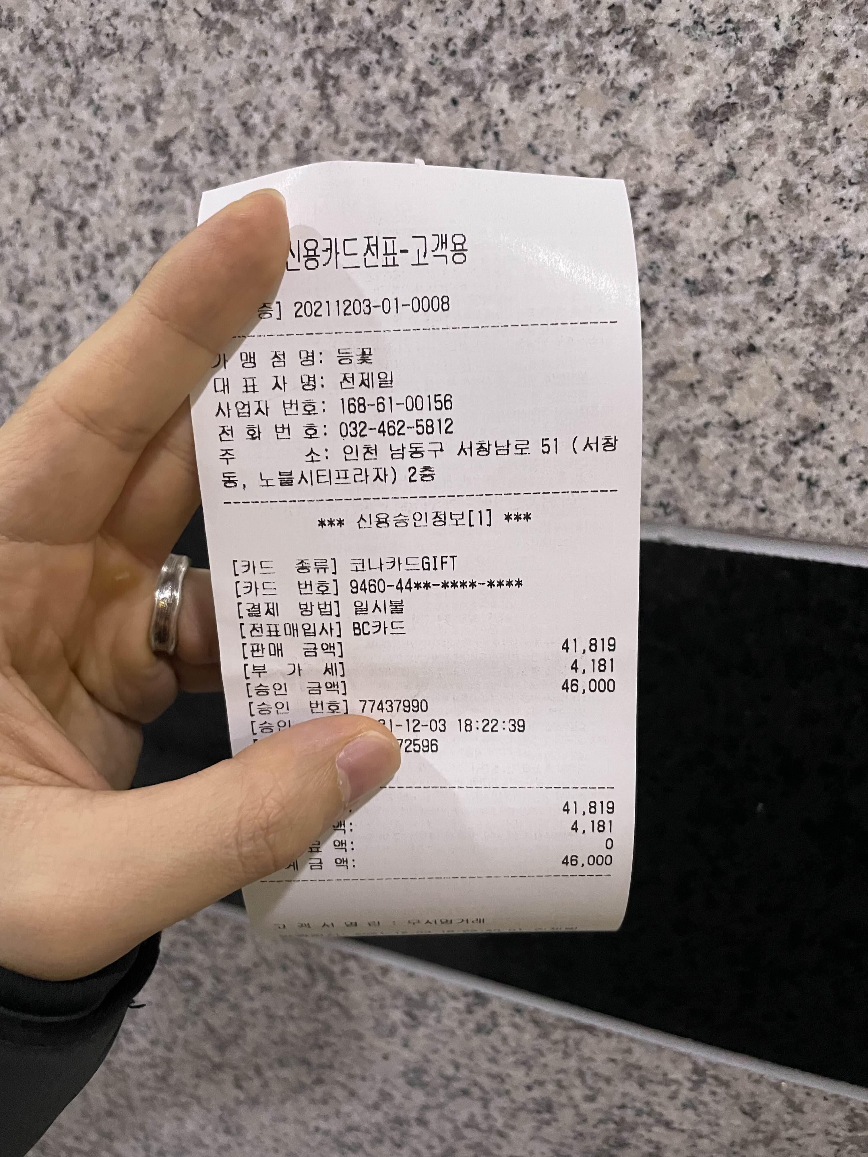 인천에서는 지역화폐 카드인 <인천 이음 카드>를 사용하면 사용한 금액의 10%를 50만 원 내에서 포인트로 캐시백 해주고 이 포인트는 현금처럼 사용이 가능하기 때문에 해당 카드를 사용해서 음식을 먹었고, 캐시백을 포함하면 약 42,000원이라는 가격에 아주 만족스러운 한 끼 식사를 할 수 있었다.