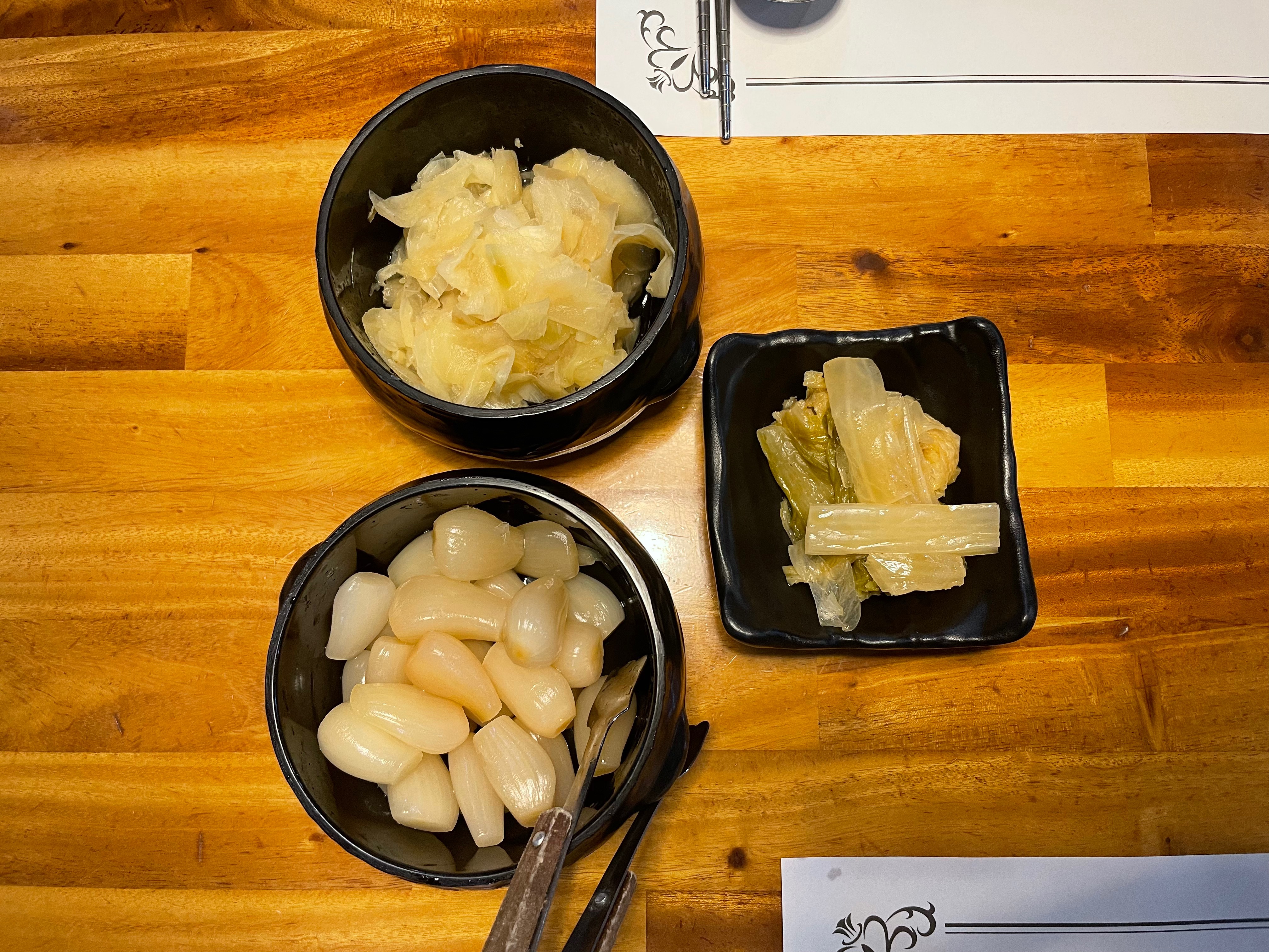 먼저 된장국과 묵은지, 생강 초절임, 락교를 준비했다. 묵은지를 빼고 락교와 생강 초절임은 큰 항아리(?)에서 개인이 먹을 만큼만 꺼내서 먹는 위생적인 방법으로 먹을 수 있어서 좋았다.