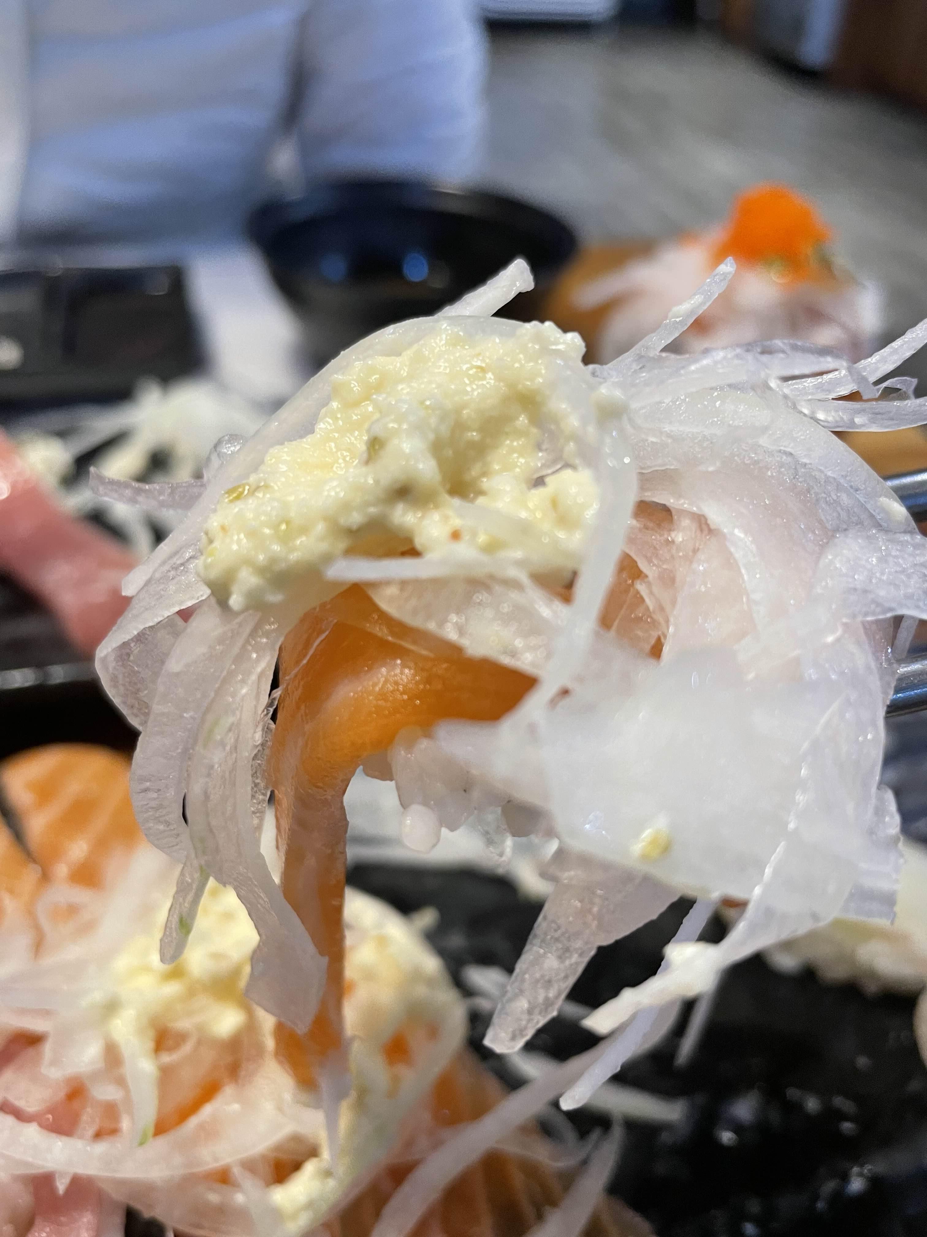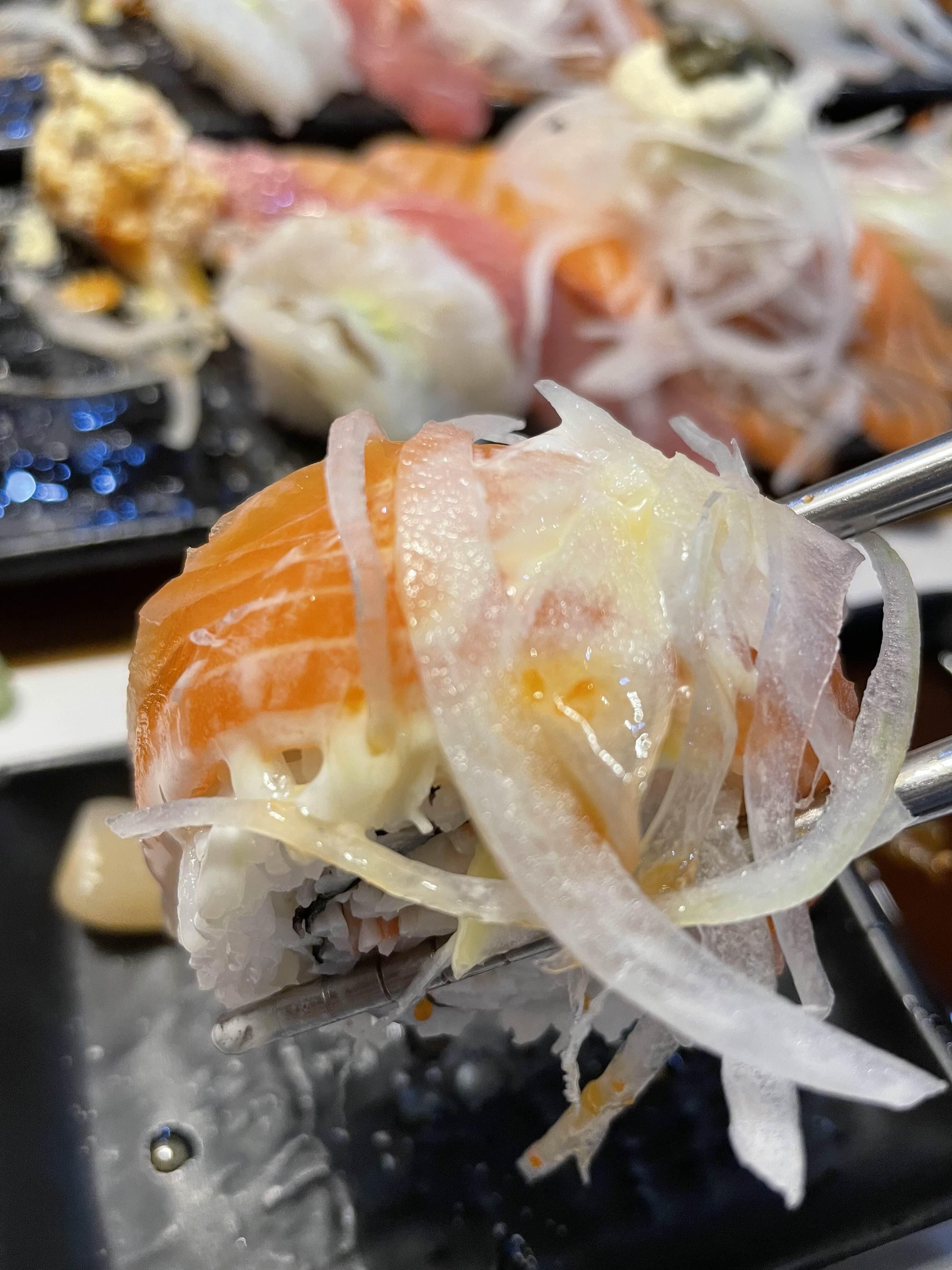 연어초밥은 연어롤과 또 다른 매력을 가졌다. 연어롤은 롤 가운데 있는 내용물인 게맛살(?) 맛과 함께 난다면 연어초밥은 그저 연어의 향과 더불어 등꽃에서 만든 양파 위의 소스가 내 입안에서 조화를 이루었다고 말할 수 있겠다. 기존에 직사각형으로 댕강 잘려있는 연어초밥을 상상했다면 그것과는 전혀 다른 초밥의 세계를 열어줄 거라 믿어 의심치 않는다.