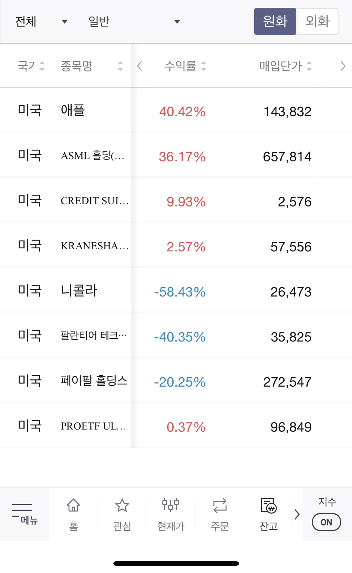 나의 경우는 1 주택을 인플레이션 헷지의 용도와 실거주 용도로 구매하는 것 이외에는 부동산 투자보다 주식의 초과수익률이 훨씬 더 높을 수 있다고 생각하기 때문에 무조건 복리를 이용한 주식투자를 하기를 추천한다. 또한 급등주나 테마주에 투자하기보다는 앞으로의 시대를 이끌어갈 빅 테크와 반도체에 장기투자가 결국 승률을 올리는 방법이 아닐까 생각한다. 나는 개인적으로 아래의 사진처럼 애플과 ASML 두 기업을 적립식으로 매수해왔는데, 그래서 평단가가 낮은 편은 아님에도 불구하고 나름 괜찮았다. 물론 실패(?) 한 것들도 거짓 없이 보여주는 것이 맞다고 생각하여 아래 매수한 종목들도 가리지 않았다.(니콜라는 단 '1주'니까 걱정하지 않아도 된다.)