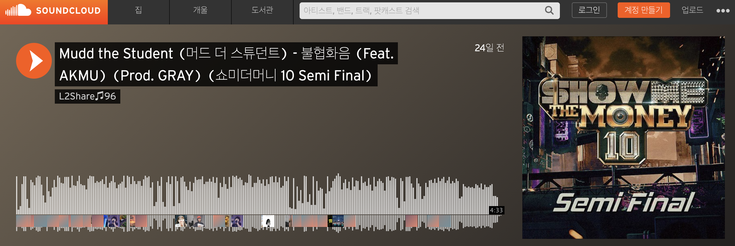 1. 사운드 클라우드에 접속해서 내가 다운로드할 음악을 선택한다. 나의 경우는 요즘 '대세'라고 할 수 있는 "힙~합~은 안 멋져"라는 가사가 있는 머드 더 스튜던트와 악뮤가 부른 '불협화음'을 선택했다.
