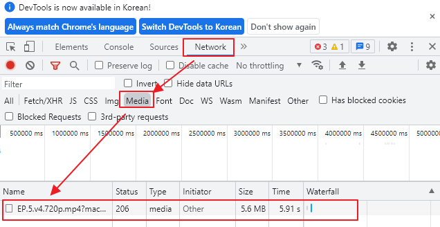 2. 아래의 사진처럼 상단 <Network>를 누르고 화살표 표시를 따라가서 <Media>를 누른 후에 내가 다운로드받고 싶은 동영상을 재생하면 우측에 파일 이름과 함께 새로운 항목이 생기고, 사진에서 마지막 화살표가 가리키는 곳을 더블클릭하면 '새 창'이 뜨면서 동영상이 새롭게 재생될 것이다.
