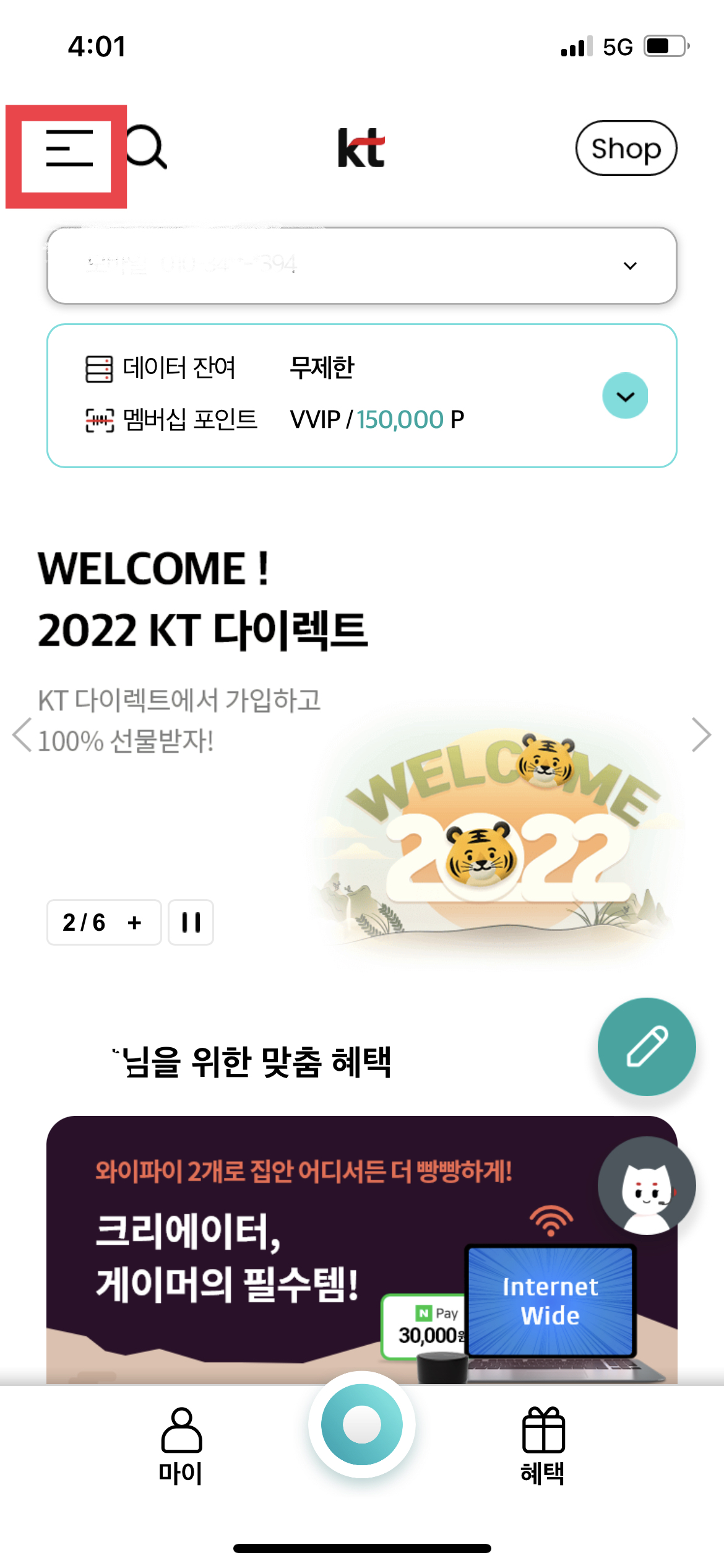 부가서비스를 확인하면 일단 스마트폰에 <마이 케이티> 앱이 설치되어 있어야 한다. 해당 앱을 설치하고 실행하면 아래와 같은 화면이 보일 것이다. 일단 아래의 화면이 떴다면 50%는 성공이다.