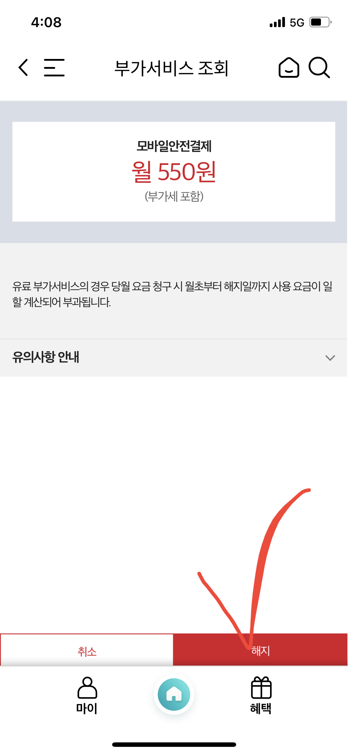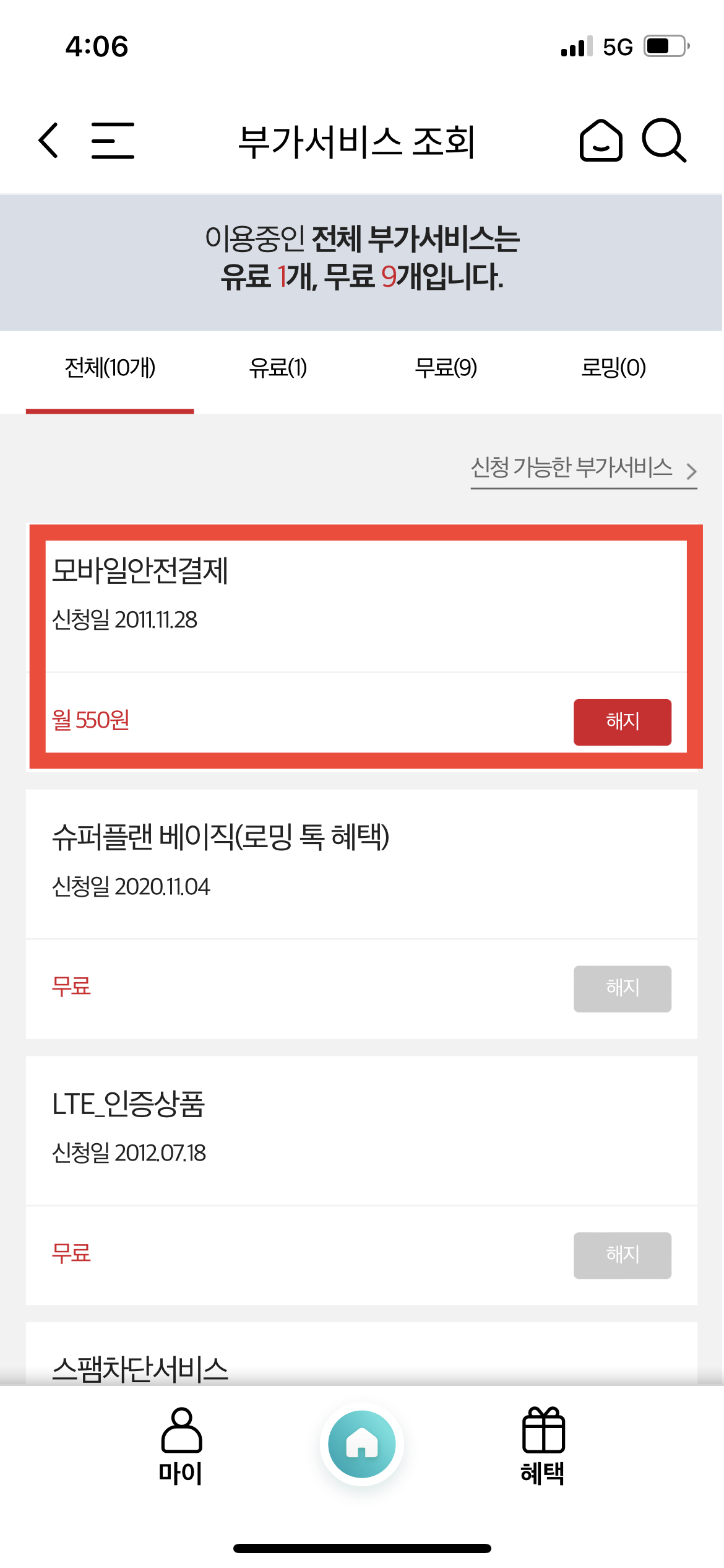 위의 사진처럼 내가 현재 어떤 부가서비스를 이용하고 있는지, 그리고 이용하는 부가서비스 중에서는 유료 서비스가 몇 개고 무료 서비스가 몇 개인지도 정확하게 알 수 있다. 나는 이미 포스팅 전에 부가서비스들을 대부분 해지해 놓은 상태라 유료 부가서비스는 1개뿐이다. 해지하고자 하는 부가서비스 오른쪽에 보면 빨간색으로 <해지>버튼이 있다. 그걸 눌러준다.