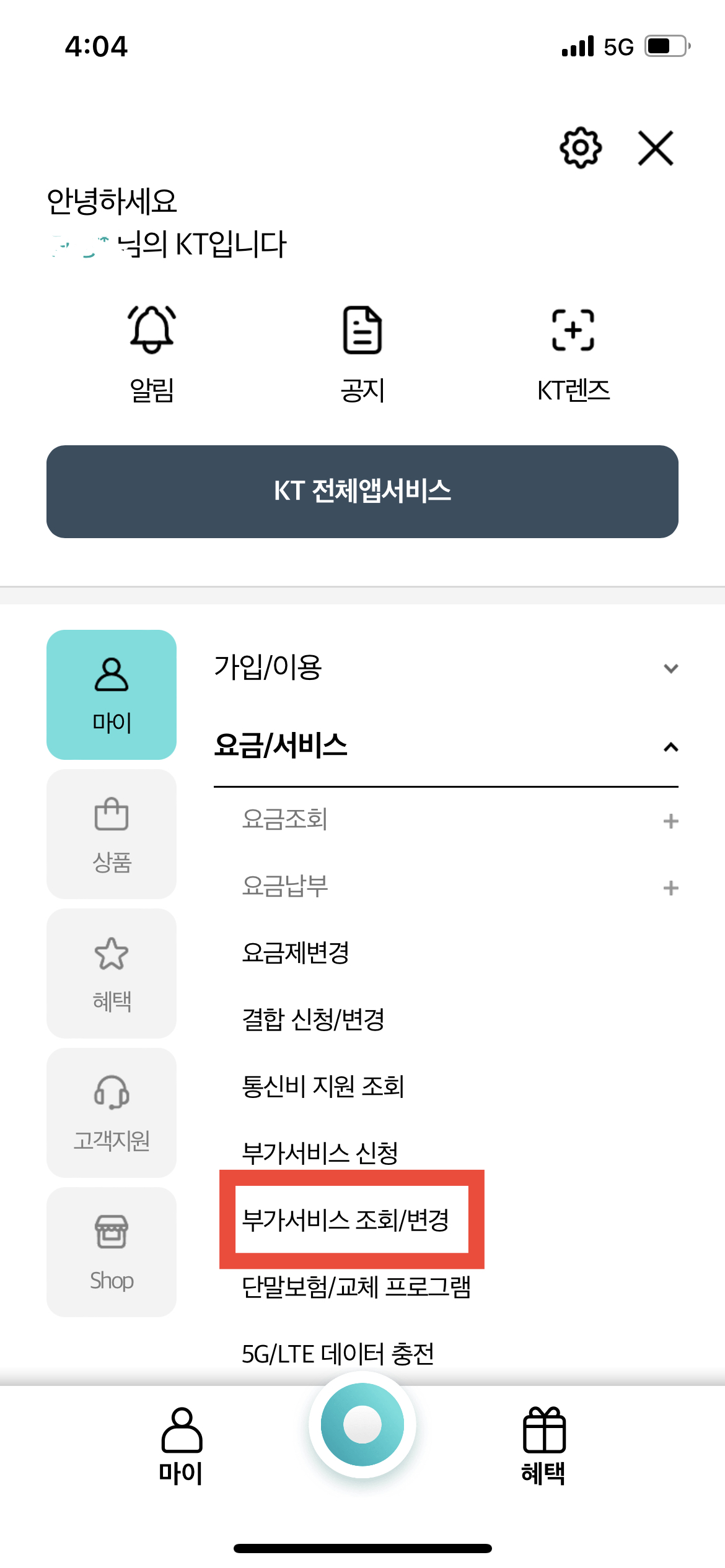 위의 사진과 같은 화면이 나온다면 <요금/서비스>탭을 누르고 <부가서비스 조회/변경>을 눌러준다.