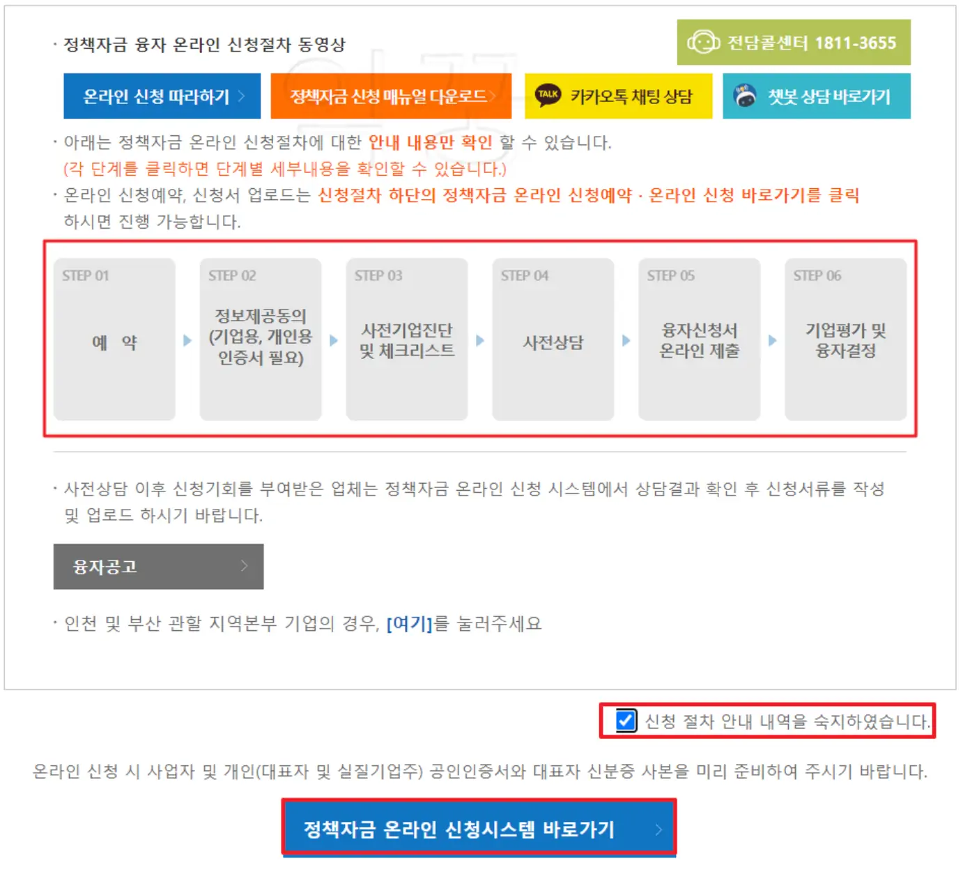 온라인 신청을 하기 위해 해당 메뉴를 클릭하면 아래 사진처럼 어떤 절차와 순서를 거쳐서 진행되는지 한눈에 볼 수 있도록 해주고 그 내용을 숙지했다고 체크를 한 뒤에 가장 아래에 보이는 [정책자금 온라인 신청시스템 바로가기]를 클릭해 주도록 하자.