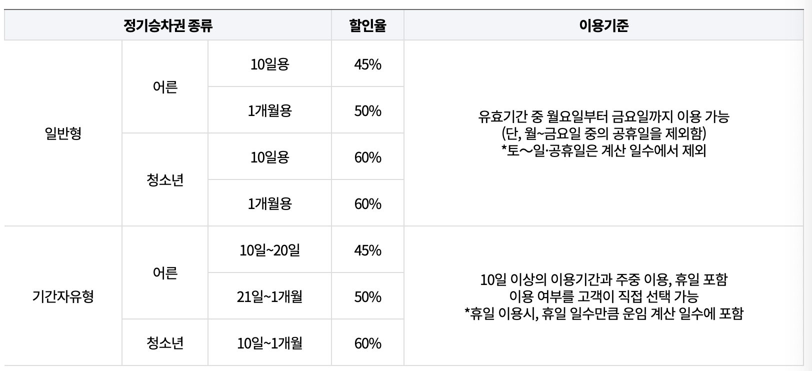 지정한 승차구간을 유효기간 동안 1일 2회(왕복)이용 가능하고 45~60%까지 운임을 할인해주는 혜택을 제공해요.